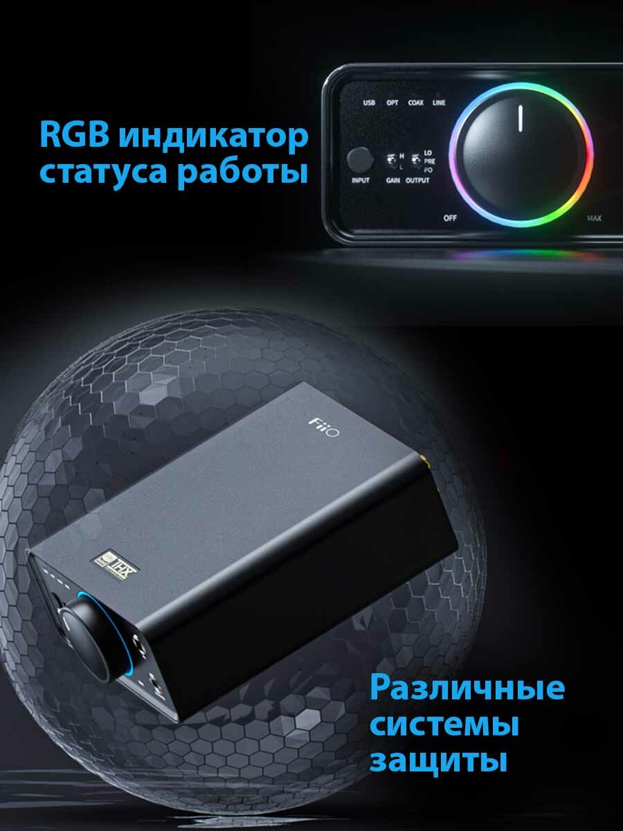 - RGB подсветка с индикацией форматов воспроизведения PCM/DSD и режимом входа;