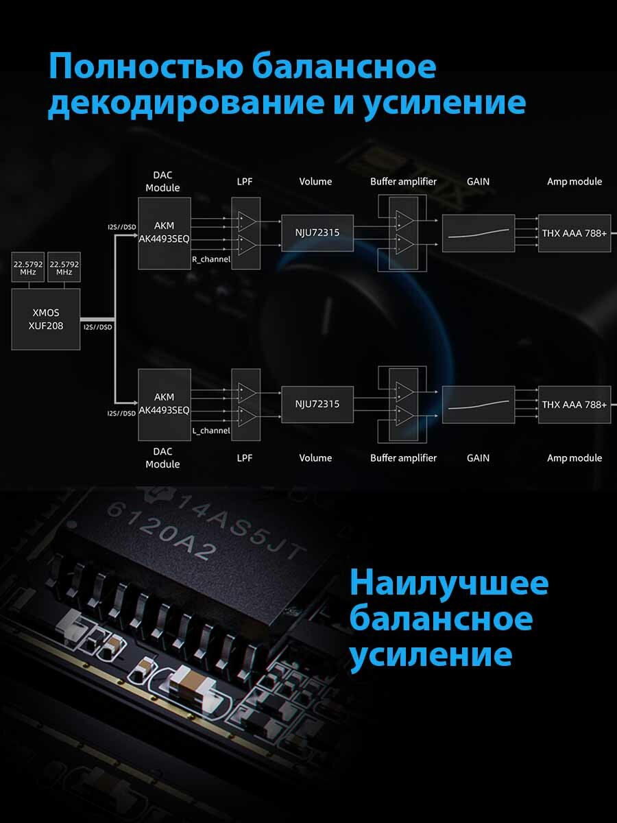 Левый и правый каналы оснащены эффективным высокопроизводительным ЦАП AK4493SEQ. Благодаря точности воспроизведения тембра этого ЦАП, его богатому и деликатному звучанию вы сможете заново открыть для себя свою музыку.