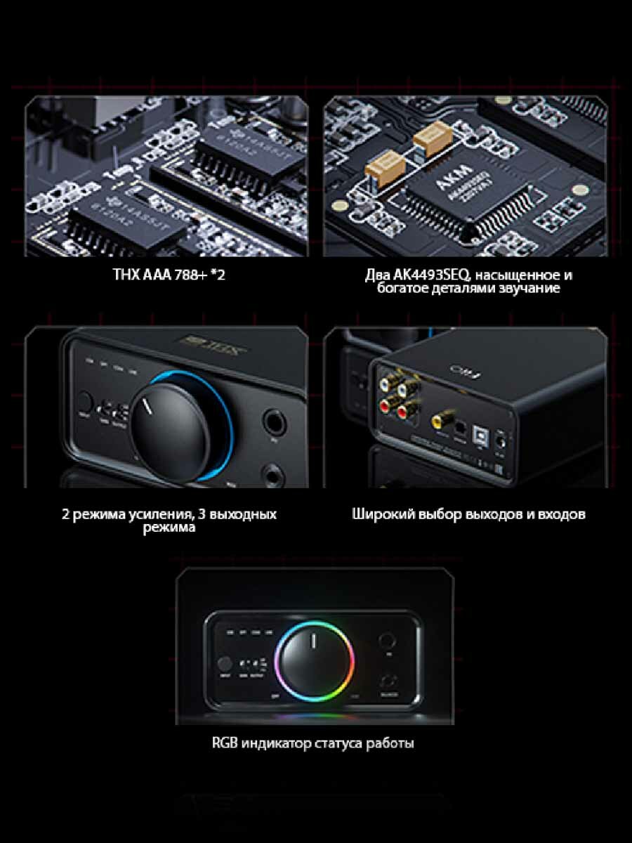 имеет изготовленную из алюминиевого сплава конструкцию, тщательно обработанную с помощью станка с ЧПУ и других технологических процессов обработки. Его элегантный черный цвет идеально дополняется золотыми вставками значков THX и Hi-Res Audio, дополненными всплеском цвета от RGB-подсветки для создания роскошного внешнего вида.