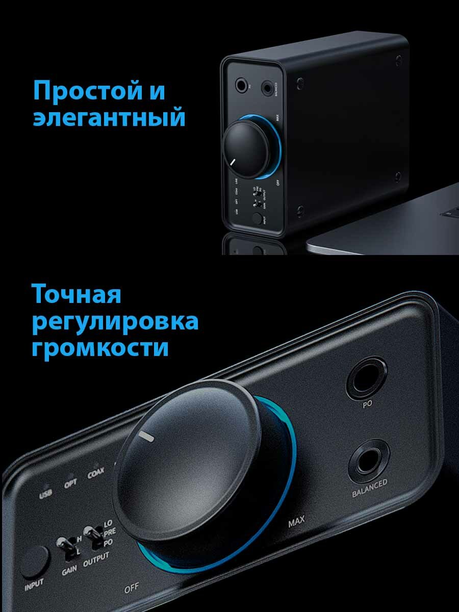 Высокий и низкий уровни аппаратного усиления позволяют легко настроить для работы с наушниками с различными импедансами и чувствительностью, обеспечивая насыщенное и стабильное прослушивание.