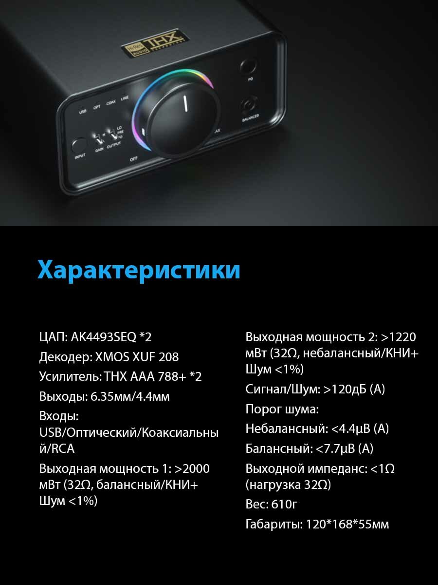 В установлены те же усилители THX AAA 788+, что и в K9 PRO, способен выдавать мощность 560 мВт на нагрузку 300 Ом при искажении 1%, а также 2000 мВт на нагрузку 32 Ом при искажении 1%. Это гарантирует для наушников с широким спектром сопротивления и самое главное, позволяет вам ощутить музыкальность, которая обязательно затронет струны вашего сердца.