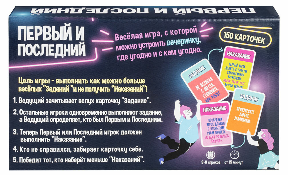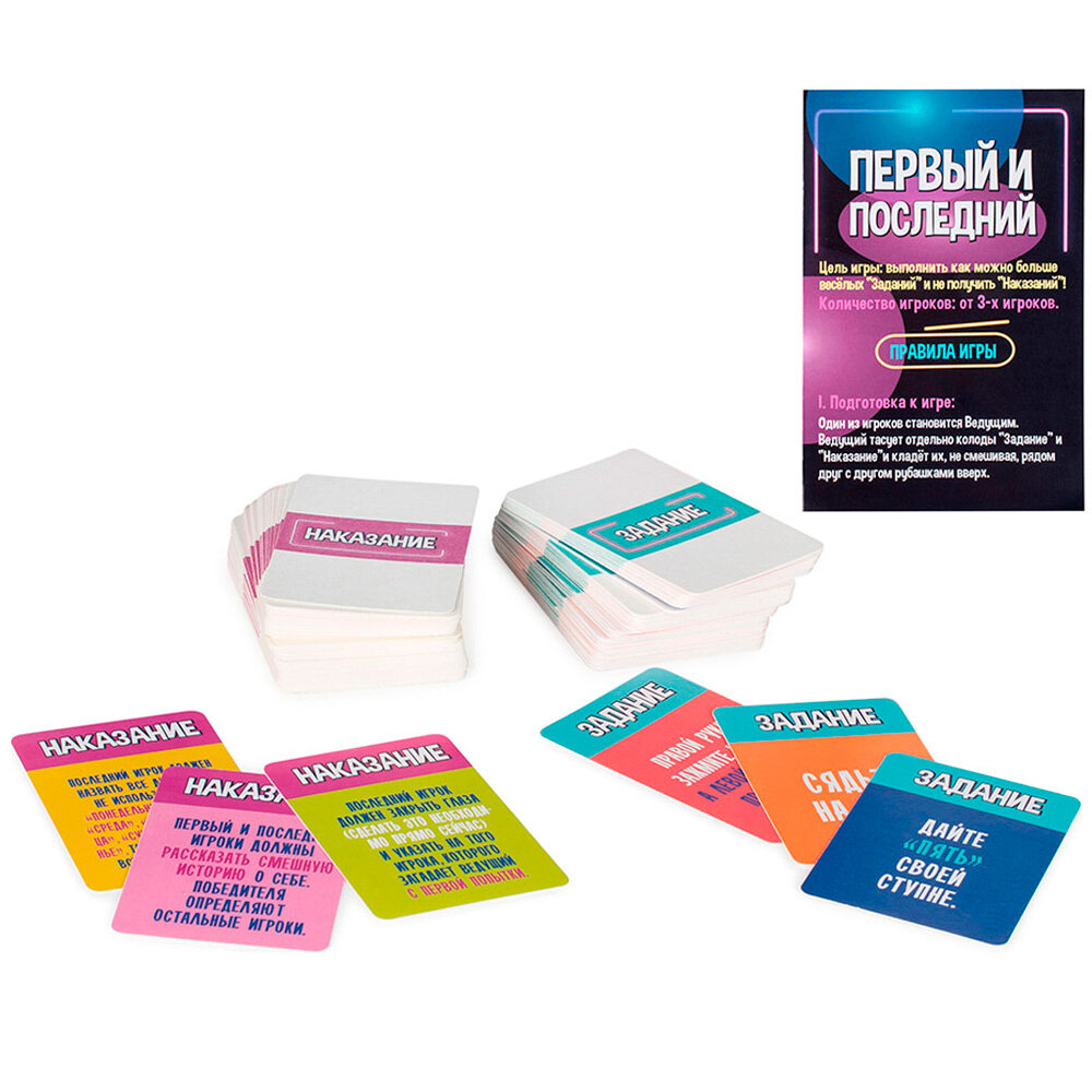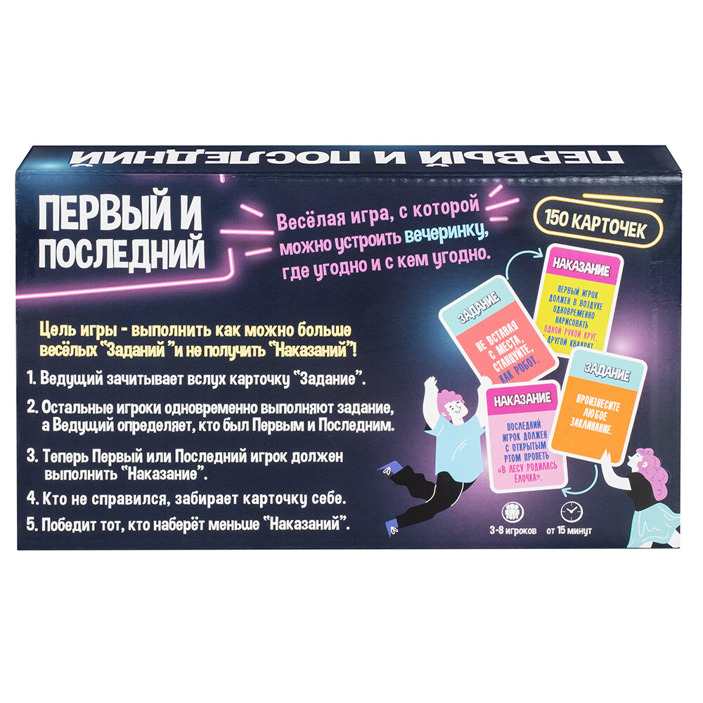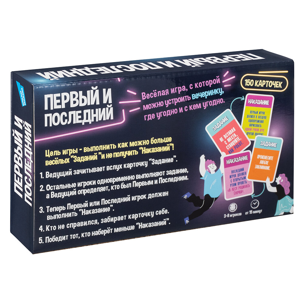 "Первый и Последний" - весёлая игра, с которой можно устроить вечеринку где угодно и с кем угодно! Цель игры: выполнить как можно больше весёлых заданий и не получить наказаний. 150 карточек с различными заданиями и наказаниями для игроков не оставят равнодушным никого. Для победы понадобится только хорошее настроение и отличная компания. Игра прекрасно подойдёт для весёлой вечеринки, встречи друзей или семейного досуга. Это больше, чем фанты, это настоящая вечеринка в коробке.