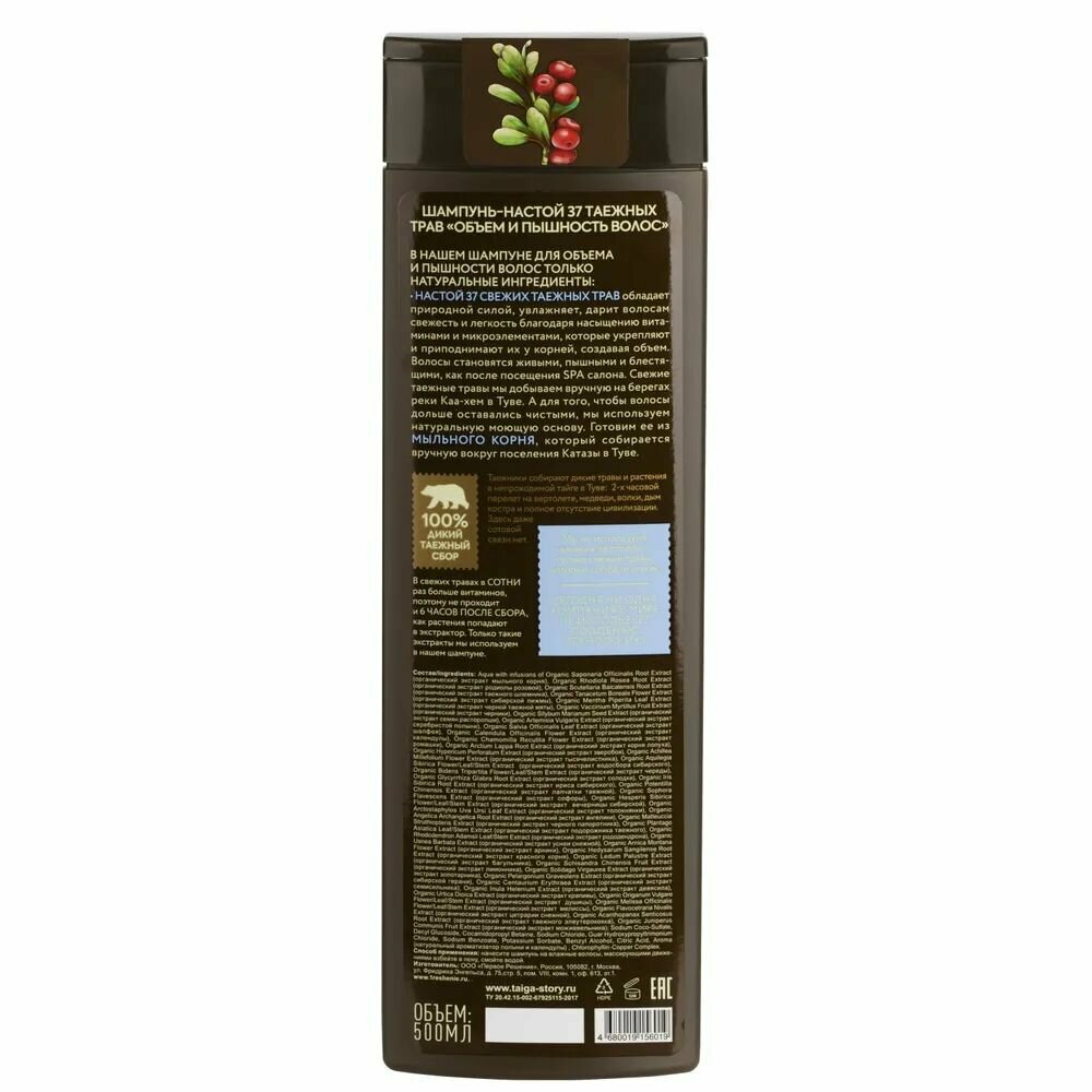В нашем шампуне для объема и пышности волос только натуральные ингредиенты: НАСТОЙ 37 СВЕЖИХ ТАЕЖНЫХ ТРАВ обладает природной силой, увлажняет, дарит им свежесть и легкость благодаря насыщению витаминами и микроэлементами, которые укрепляют и приподнимают волосы у корней, создавая объем. Волосы становятся живые, пышные и блестящие, как после посещения SPA салона. Свежие таежные травы мы добываем вручную на берегах реки Каа-хем в Туве. А для того, чтобы волосы дольше оставались чистыми, мы используем натуральную моющую основу. Готовим ее из МЫЛЬНОГО КОРНЯ, который собирается вручную вокруг поселения Катазы в Туве.- волосы упругие и объемные от корней;- пышные и послушные волосы;- облегчает расчесывание;- видимый результат, как после посещения SPA салона.
