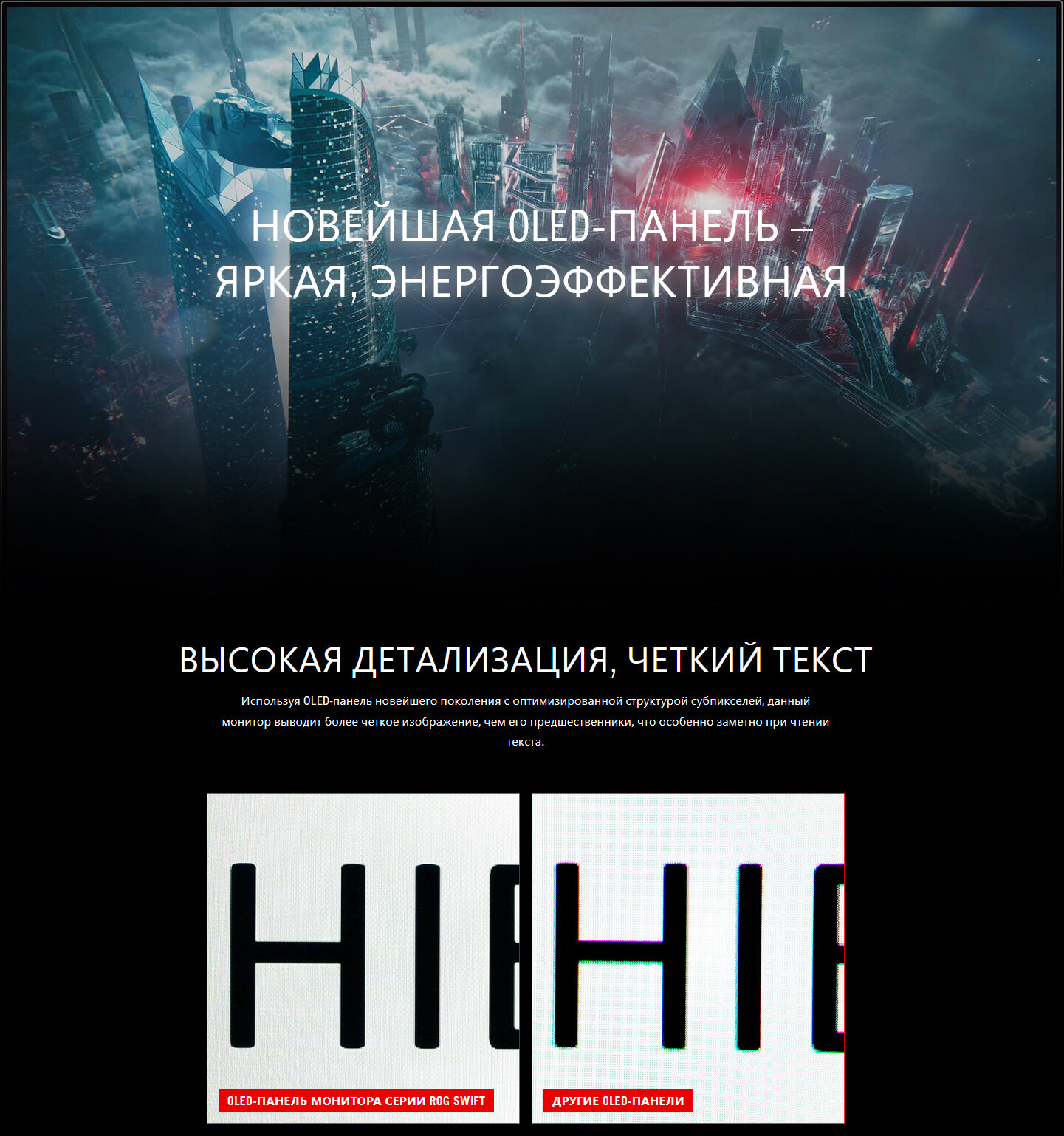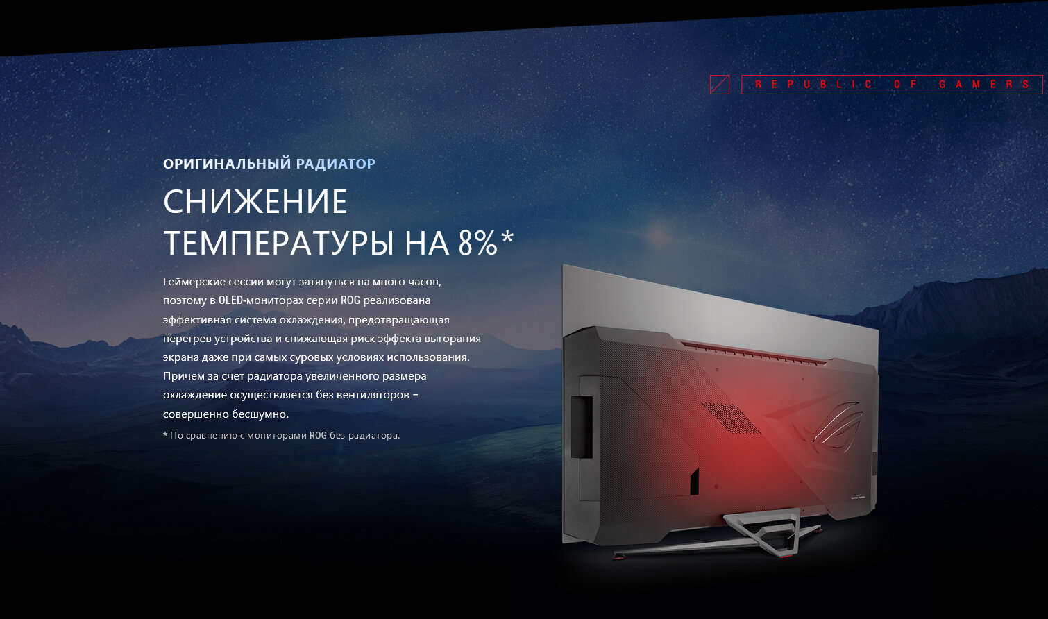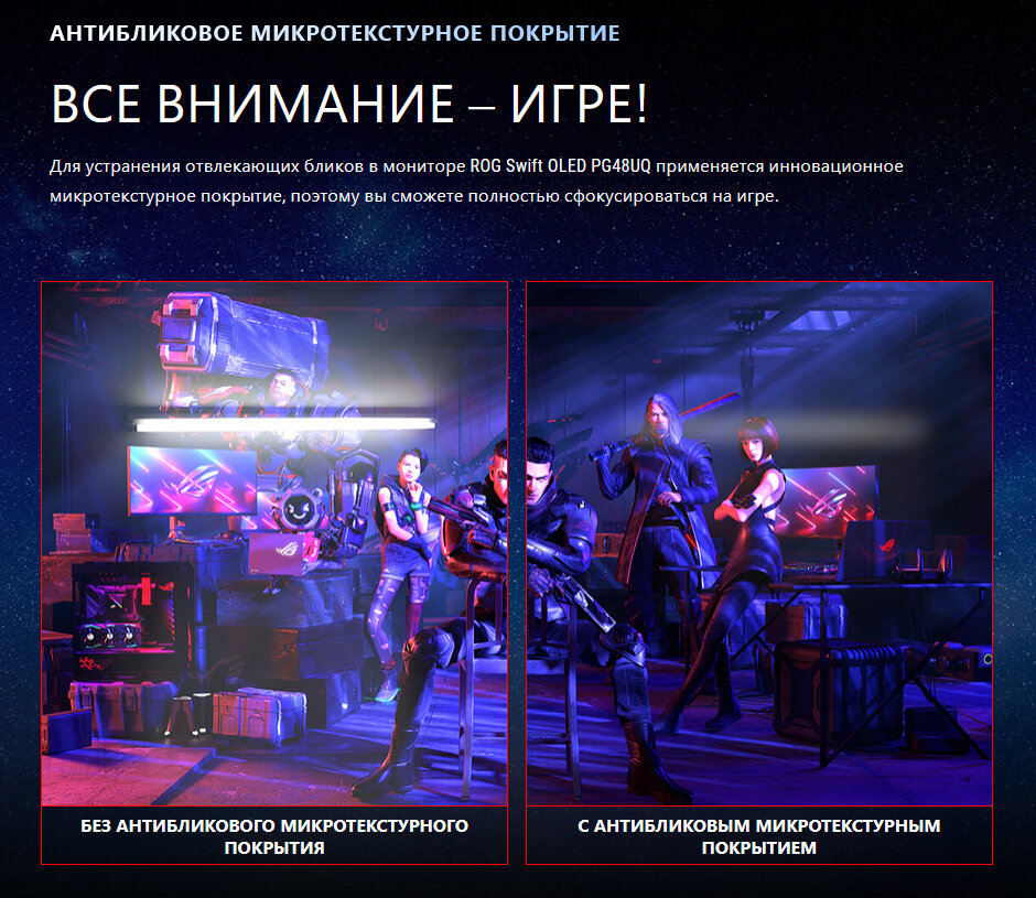 ROG Swift OLED PG48UQ — это 47,5-дюймовый игровой 4K OLED-монитор с антибликовым микротекстурным покрытием, которое уменьшает отражения и обеспечивает более точную цветопередачу на экране. Сверхбыстрая частота обновления 138 Гц (при разгоне) и невероятное время отклика 0,1 мс обеспечивают невероятно захватывающий игровой процесс в большем масштабе. Плюс 98% цветовой гаммы DCI-P3, настоящий 10-битный цвет и Delta E < 2 обеспечивают реалистичные цвета и максимально темные оттенки черного.
