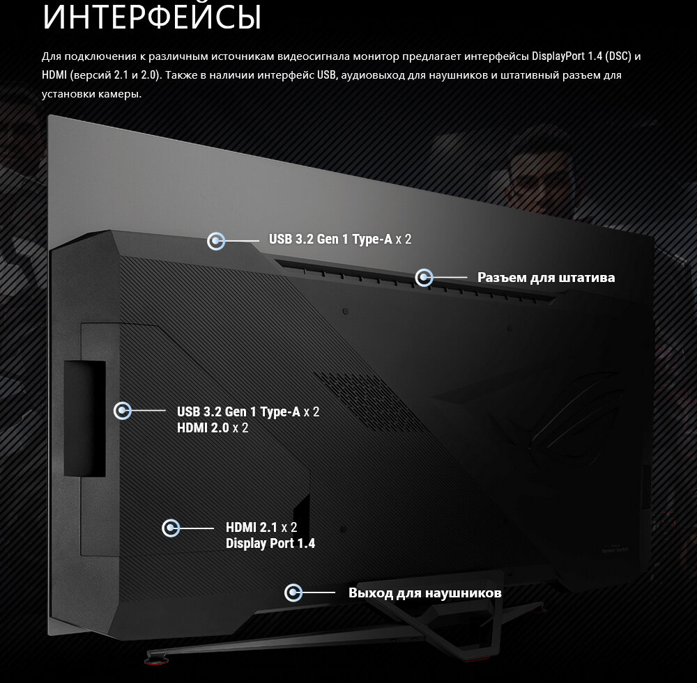 | Разъемы | DisplayPort x 1, HDMI x 4, USB Type-A х 4 шт, выход на наушники |