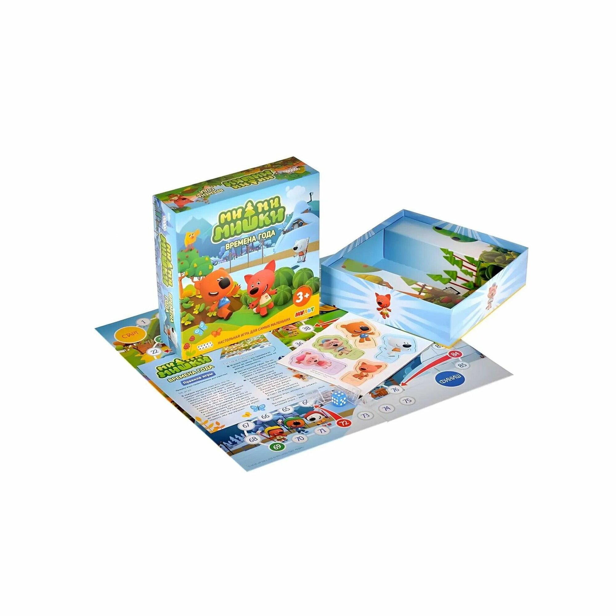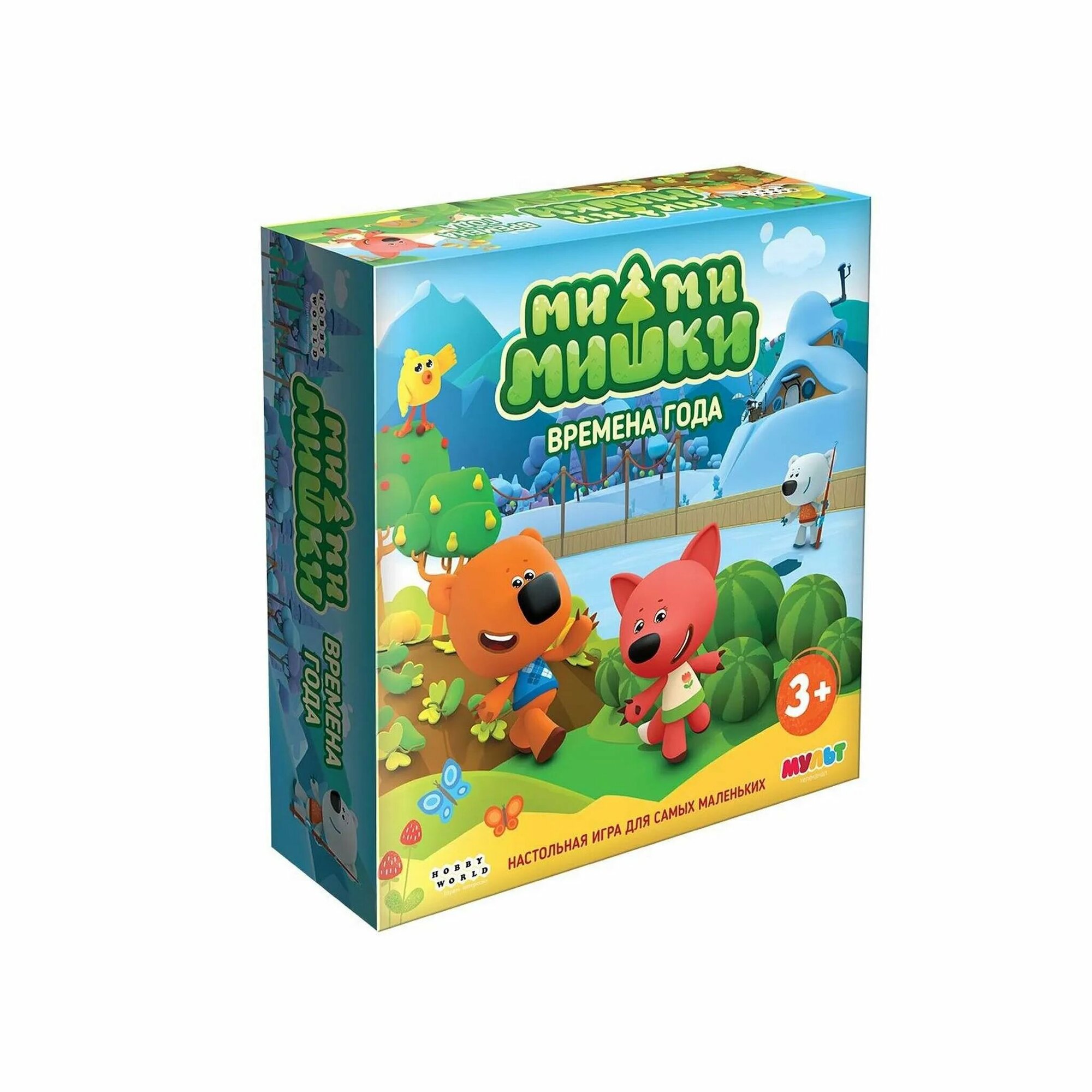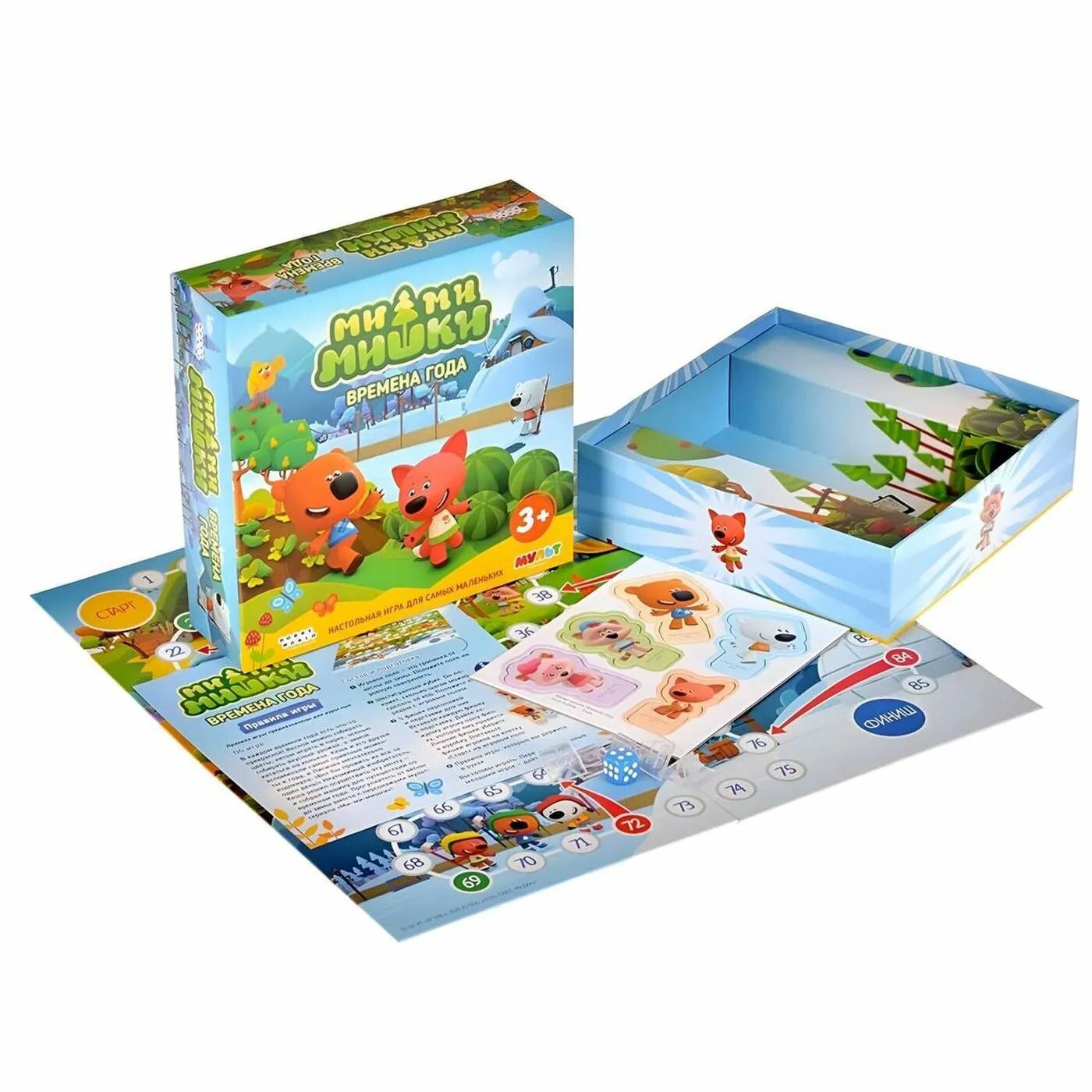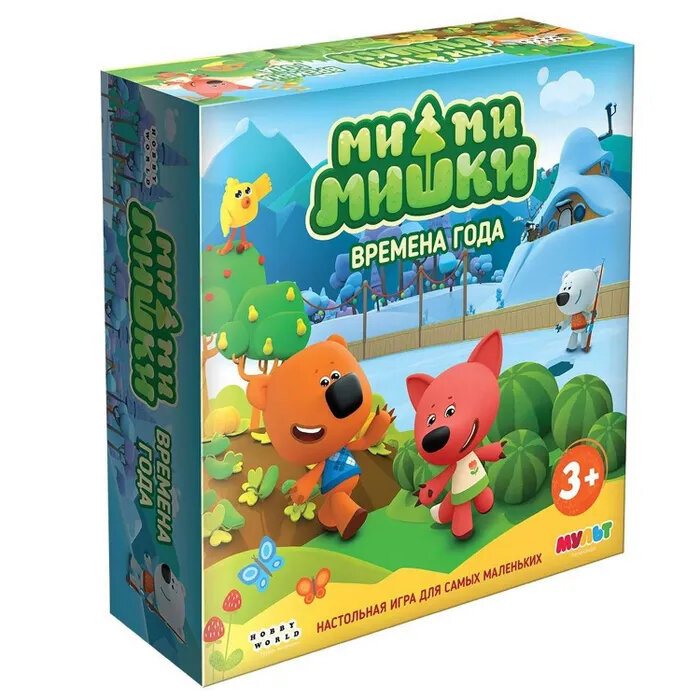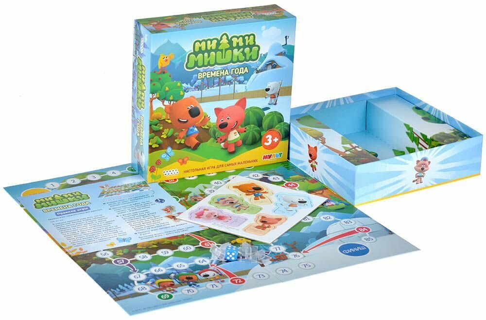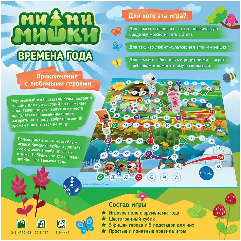 Ох уж этот Кеша! Вечно изобретает всякие штуки: то напоминалку, то портал… То вообще машину, которая позволяет путешествовать по разным временам года! Подумать только: теперь друзьям не нужно ждать, чтобы побегать по весенним полям, полежать на солнышке, посмотреть на рыжие осенние листья или покататься на льду! Присоединяйтесь и поучаствуйте в веселье с Ми-ми-мишками! Об игре Настольная игра "Ми-ми-мишки: Времена года" – это классическая бродилка, в которую легко сможет играть вся семья. В компании любимых персонажей вы пройдёте по четырём временам года и узнаете, кто является самым удачливым! Как играть? Правила "Времён года" предельно просты, что позволит без проблем пригласить детей от трёх лет. В свой ход вы бросаете кубик и двигаете фишку на выпавшее количестве клеток. При этом некоторые ячейки на поле обладают особыми свойствами: Зелёная клетка позволит вновь подвигаться на то же количество клеток Фиолетовая клетка продвинет вашу фишку по стрелке вперёд Красная фишка подвинет вашу фишку по стрелке назад После того, как вы продвинулись, передайте кубик игроку по часовой стрелке. Кто победил? Как только хотя бы один игрок окажется на клетке "Финиш", игра заканчивается. Поздравляем победителя – это было отличное путешествие! Ура! Игровое поле с временами года Шестигранный кубик 5 фишек героев 5 подставок для них Правила игры Размер коробки: 198x198x57 мм