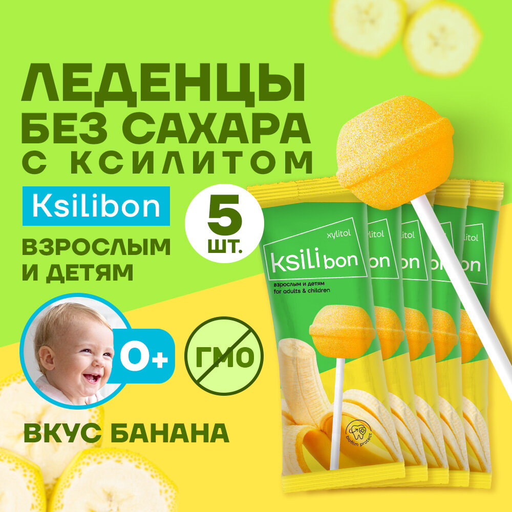 Леденцы без сахара, Ksilibon способствуют укреплению эмали и предотвращают появление кариеса. Леденцы содержат в своем составе ксилит, вещество, которое подавляет рост и развитие кариесогенных бактерий. Леденцы с ксилитом усиливают слюноотделение, повышают защитные свойства слюны, приводят в норму кислотно-щелочной баланс полости рта. Леденцы на палочке в удобном формате, безопасны в употреблении. Ksilibon станут отличным вариантом для диабетиков и заменят конфеты без сахара для диабетиков. Новый приятный вкус банана понравится, как детям, так и взрослым. Леденцы можно презентовать ребенку, маме, папе, как полезный подарок, сладкий подарок и подарок на день рождения. Рекомендации к применению: для детей и взрослых ежедневно 1-2 леденца. В упаковке 10 леденцов.