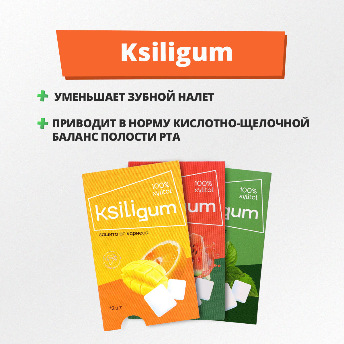 Жевательная резинка c ксилитом без сахара Ksiligum очищает, предотвращает налёт, эффективно блокирует образование кариеса, реминерализирует эмаль - усиливает слюноотделение, повышает защитные свойства слюны, приводит в норму кислотно-щелочной баланс полости рта. Жвачка Ksiligum не содержит сахар и консерванты, в качестве подсластителя использован натуральный ксилит, получаемый из растительных компонентов и древесины лиственных пород. Жевательная резинка Ksiligum станет отличным вариантом для диабетиков, так же, жвачку можно презентовать ребенку от 6 лет как полезный или сладкий подарок.Рекомендованная суточная доза:детям от 6 лет - 3-4 подушечки в деньвзрослым - 5-7 подушечек в деньВ блистере 12 штук.Жвачка с освежающим вкусом манго и апельсина понравится детям и взрослым.