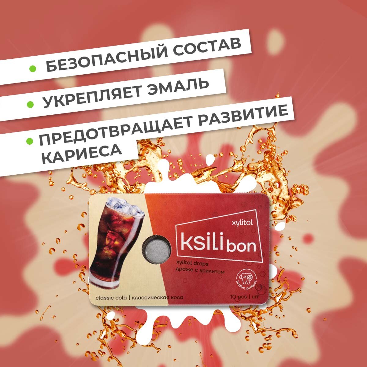 Леденцы без сахара с ксилитом Ksilibon для детей и взрослых. В упаковке 10 драже со вкусом кока-колы.Содержащийся в них ксилит подавляет рост и развитие кариесогенных бактерий, укрепляя эмаль и предотвращая появление кариеса. К тому же, леденцы с ксилитом стимулируют слюноотделение, что способствует поддержанию здоровой полости рта.Если вы заботитесь о своем здоровье и ищете альтернативу сладостям с сахаром, Ksilibon идеально подходят и для диабетиков.Помимо этого, Ksilibon - отличный подарок для ваших близких. Сделайте им приятный сюрприз, даря не только сладкие радости, но и заботу о здоровье. Это идеальный подарок для детей, мам, пап и всех, кто ценит качество и экологичность продуктов.Выберите Ksilibon и присоединитесь к тем, кто дарит себе и своим близким здоровье и радость каждый день!