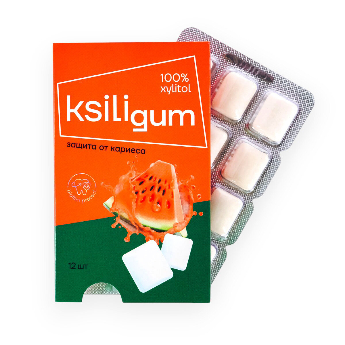 Жевательная резинка c rcbkbnjv без сахара Ksiligum очищает, предотвращает налёт, эффективно блокирует образование кариеса, реминерализирует эмаль - усиливает слюноотделение, повышает защитные свойства слюны, приводит в норму кислотно-щелочной баланс полости рта. Жвачка Ksiligum не содержит сахар и консерванты, в качестве подсластителя использован натуральный ксилит, получаемый из растительных компонентов и древесины лиственных пород. Жевательная резинка Ksiligum станет отличным вариантом для диабетиков, так же, жвачку можно презентовать ребенку от 6 лет как полезный или сладкий подарок.Рекомендованная суточная доза:детям от 6 лет - 3-4 подушечки в деньвзрослым - 5-7 подушечек в деньв блистере 12 штук.Жвачка со вкусом сочного арбуза понравится детям и взрослым.