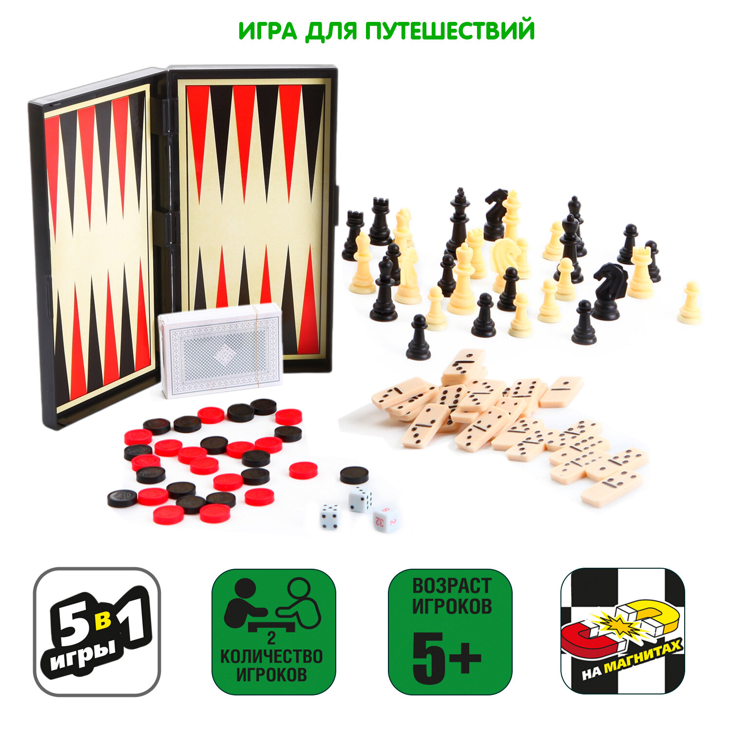 Содержит пять игр: нарды, домино, карты, шашки, шахматы.