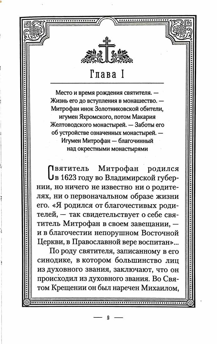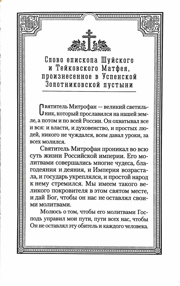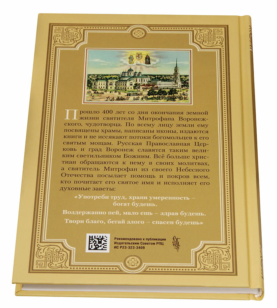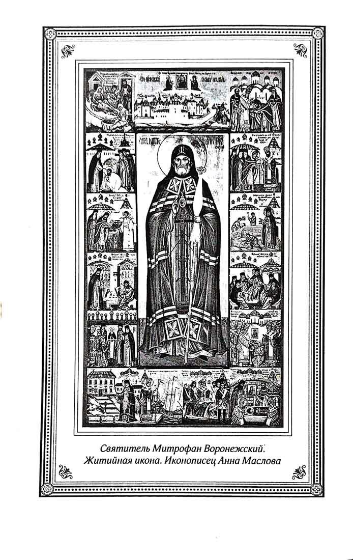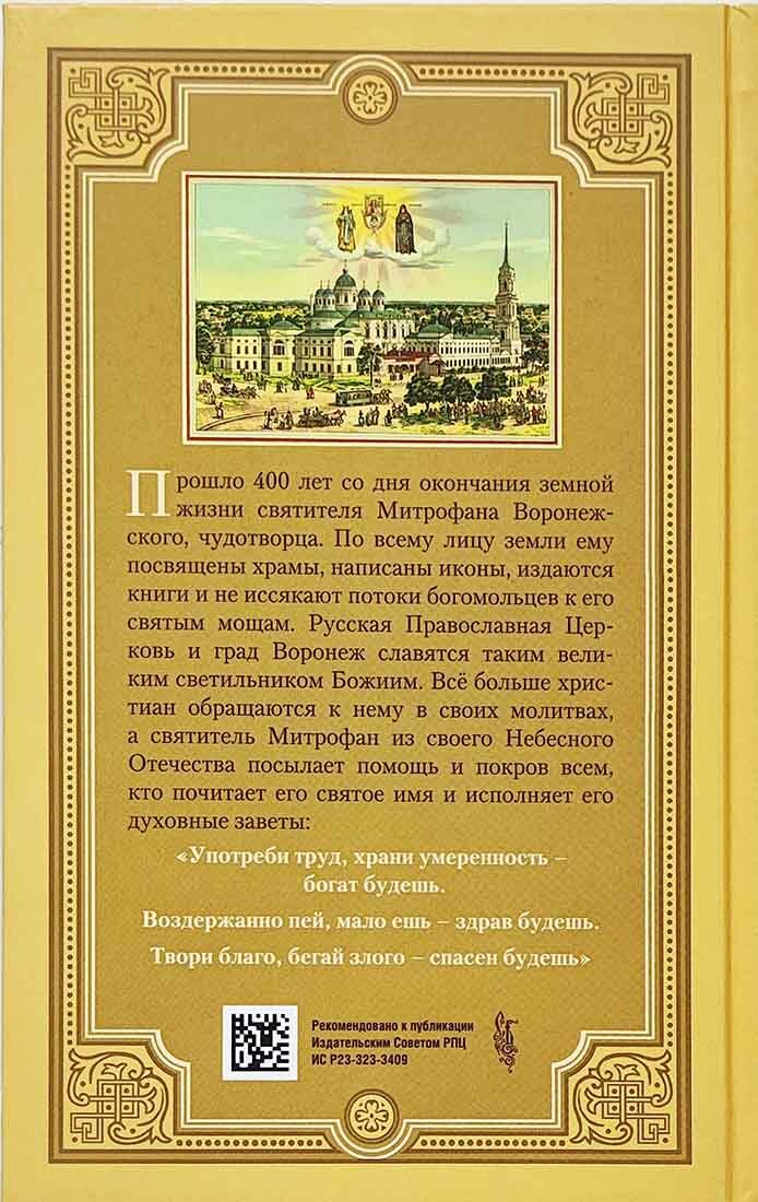 Святителя Митрофана называют Ангелом Хранителем Воронежской земли. Именно он в период смуты, когда у людей сбились ценностные установки, утратилось представление об истинной добродетели, помог людям вновь обрести веру в Бога, открыть и развить в себе такие исконно христианские качества, как милосердие и сострадание. Святитель Митрофан боролся с народными суевериями, безнравственностью, влиянием старообрядцев, наставляя паству в верности учению Святой, Соборной и Апостольской Церкви. Его труды были вознаграждены быстрым усилением авторитета Церкви. Эта книга напечатана ко дню памяти святителя, к 400-летию со дня рождения. В нее вошли: Жизнеописание святителя Митрофана, первого епископа Воронежского, составленное архиепископом, магистром Рождество-Богородицкой церкви Димит-рием Самбикиным (Воронеж: В тип. Г.?М.?Веселовского, 1869); Духовное завещание святого Митрофана, епископа Воронежского, и уникальный материал, предоставленный Золотниковской пустынью, о почитании святыми земли Российской святителя Митрофана Воронежского.