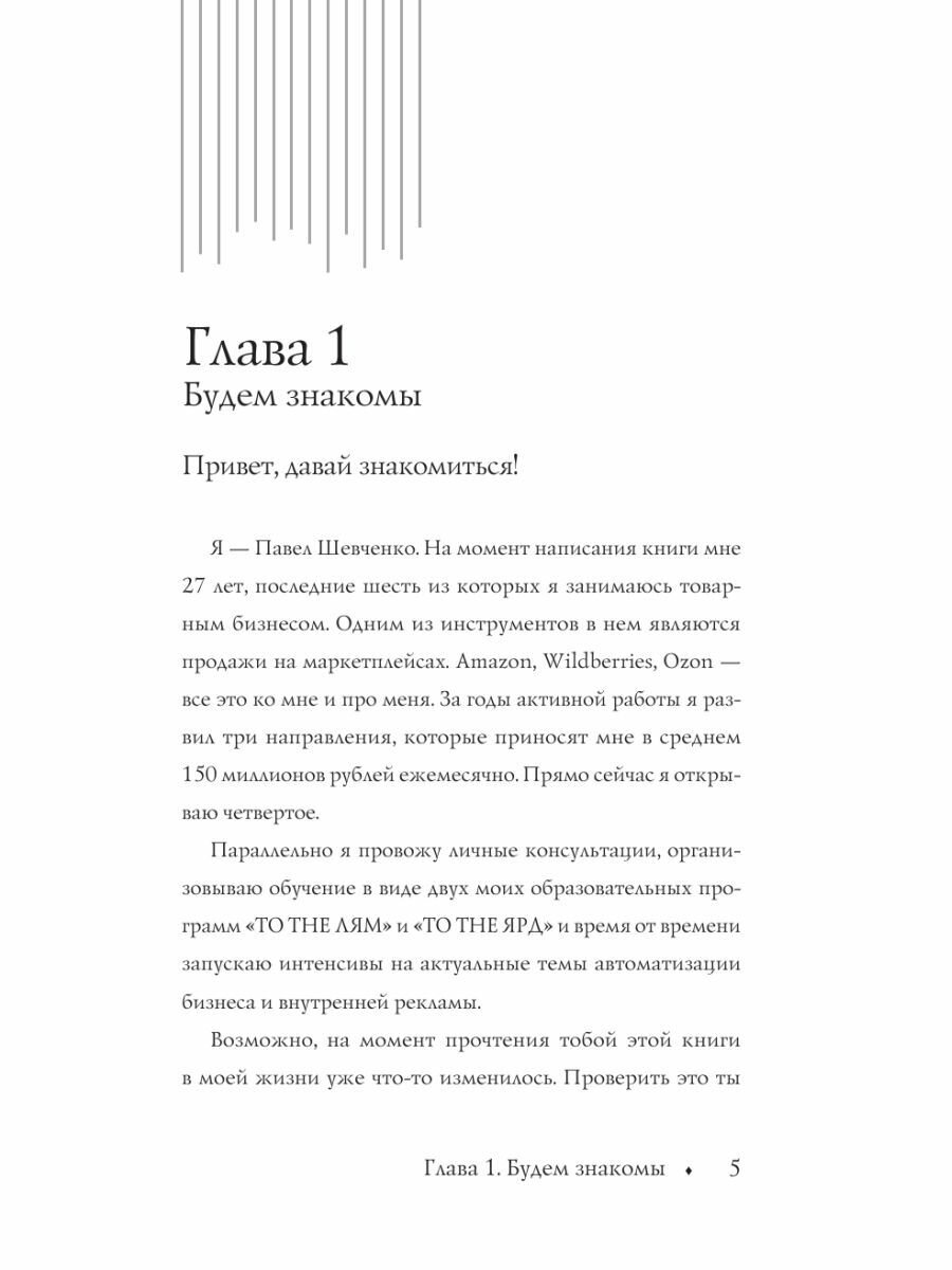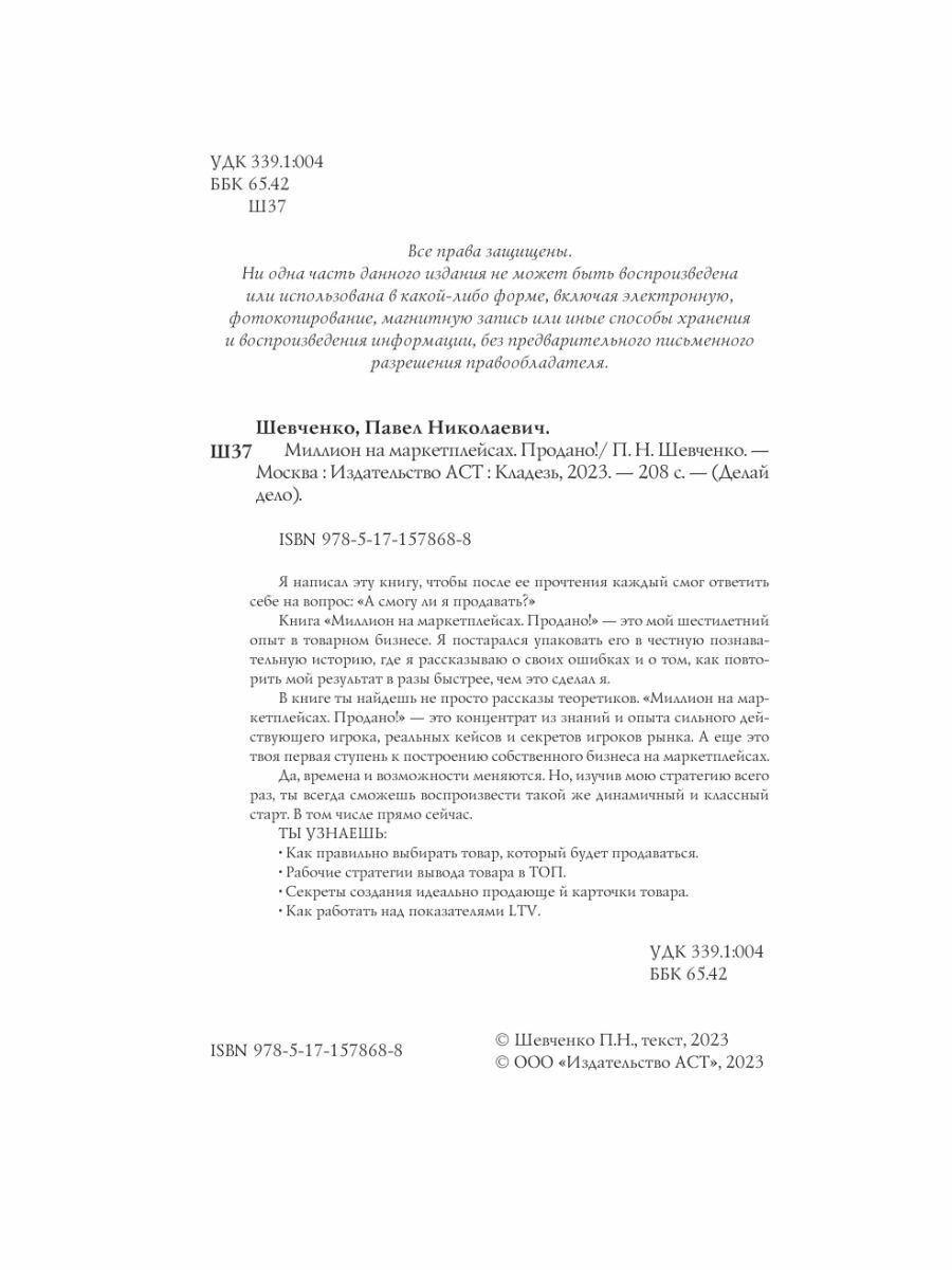Я написал эту книгу, чтобы после ее прочтения каждый смог ответить себе на вопрос: «А смогу ли я продавать?»Книга «Миллион на маркетплейсах» — это мой шестилетний опыт в товарном бизнесе. Я постарался упаковать его в честную познавательную историю, где я рассказываю о своих ошибках и о том, как повторить мой результат в разы быстрее, чем это сделал я.В книге ты найдешь не просто рассказы теоретиков. «Миллион на маркетплейсах» — это концентрат из знаний и опыта сильного действующего игрока, реальных кейсов и секретов игроков рынка. А еще это твоя первая ступень к построению собственного бизнеса на маркетплейсах.Да, времена и возможности меняются. Но, изучив мою стратегию всего раз, ты всегда сможешь воспроизвести такой же динамичный и классный старт. В том числе прямо сейчас.ТЫ УЗНАЕШЬ:• Как правильно выбирать товар, который будет продаваться.• Рабочие стратегии вывода товара в ТОП.• Секреты создания идеально продающе й карточки товара.• Как работать над показателями LTV.