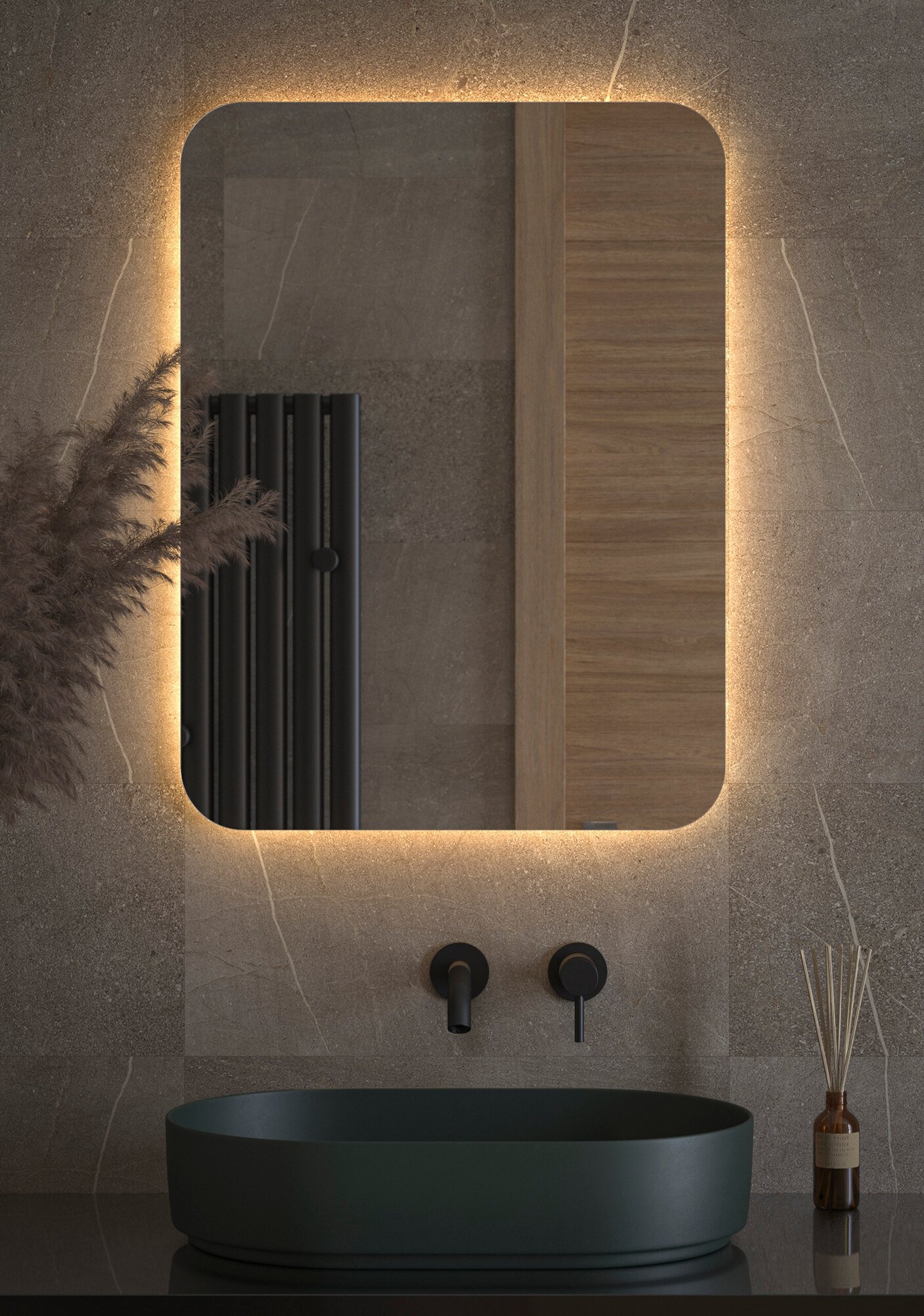 Светодиодная подсветка с цветовой температурой 3000 Кельвинов обеспечивает яркость и комфортную атмосферу в любое время суток. Это зеркало не имеет выключателя и может быть легко подключено к подготовленному электро-выводу из стены.