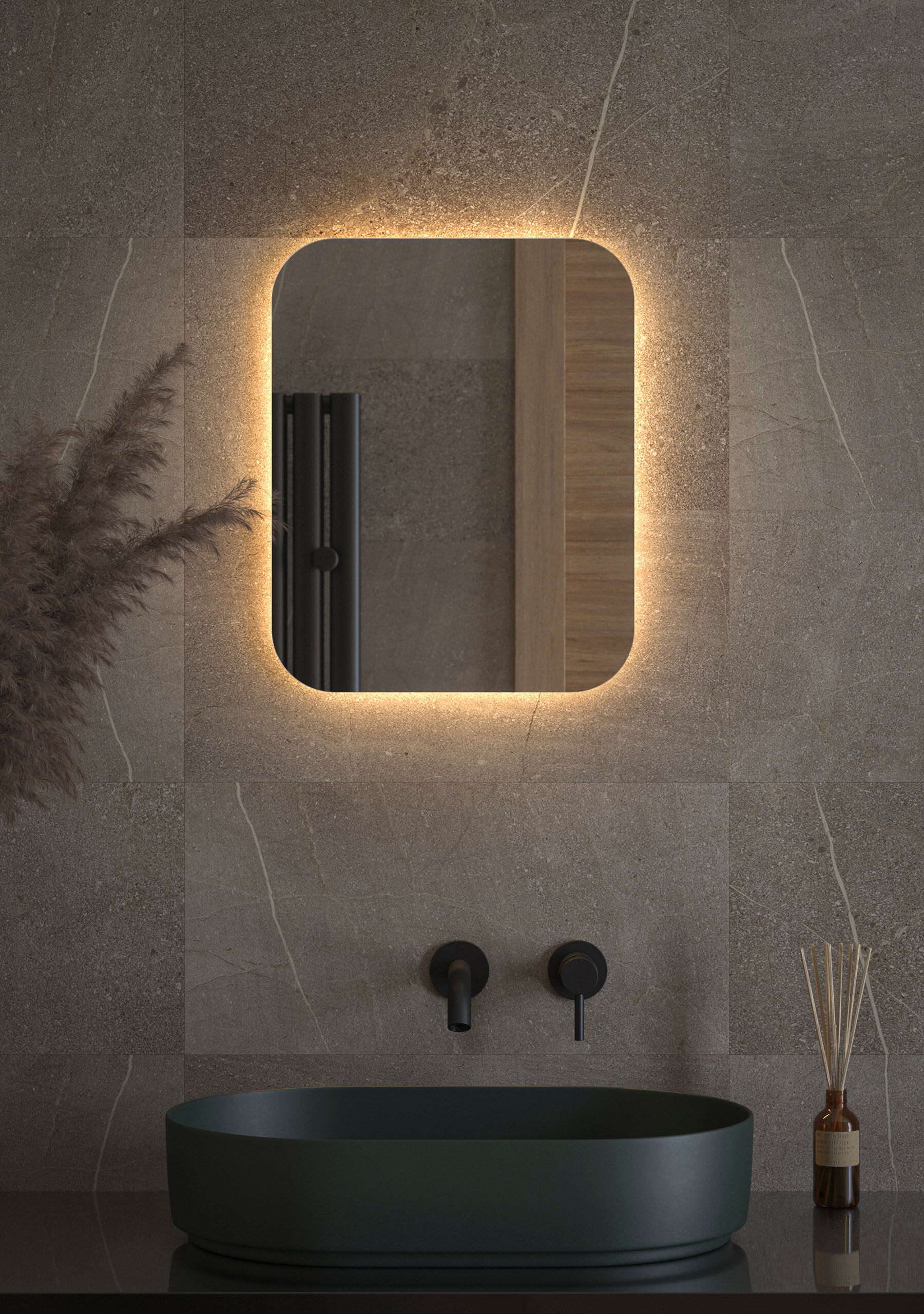 Светодиодная подсветка с цветовой температурой 3000 Кельвинов обеспечивает яркость и комфортную атмосферу в любое время суток. Это зеркало не имеет выключателя и может быть легко подключено к подготовленному электро-выводу из стены.