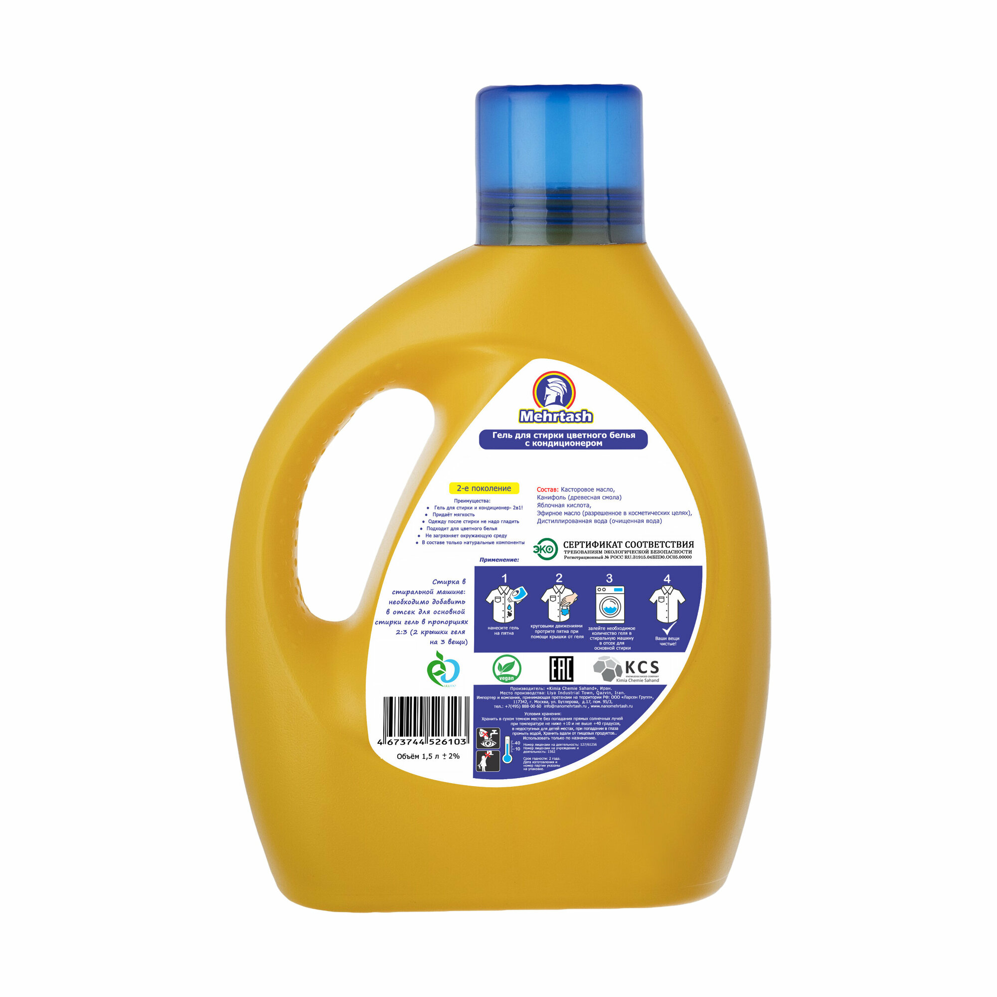 Концентрированный гипоаллергенный ЭКО гель концентрат для стирки с кондиционером белья "два в одном" Mehrtash произведен в Иране из 100% натуральных ингредиентов. Благодаря использованию нанотехнологий в производстве геля, продукт удаляет загрязнения и свежие пятна с волокон ткани ваших вещей даже в холодной воде и при коротких циклах стирки. Средство полностью выполаскивается из тканей белья, не содержит никакой химии. Благодаря натуральным компонентам и высокотехнологичному производству продукт обладает антибактериальными, антистатическими и гипоаллергенными свойствами, что делает его идеальным выбором для заботы о вашей коже. Гель подходит как для ручной стирки, так и для стирки в стиральных машинах автомат. Состав полностью безопасен для здоровья, что делает его идеальным выбором для тех, кто обращает внимание на качество и экологичность продуктов. Международные сертификаты подтверждают биоразлагаемость, безопасность и эффективность средства.