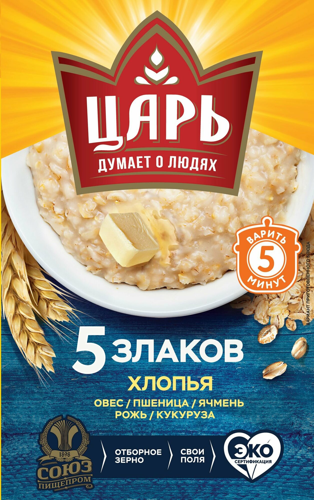 Хлопья "Царь" 5 злаков " состоят из овса, пшеницы, ячменя, рожи, кукурузы Мы используем технологию сохранения витаминов, содержащихся в зерне и оболочке зерна. Продукт становится еще полезнее и вкуснее.