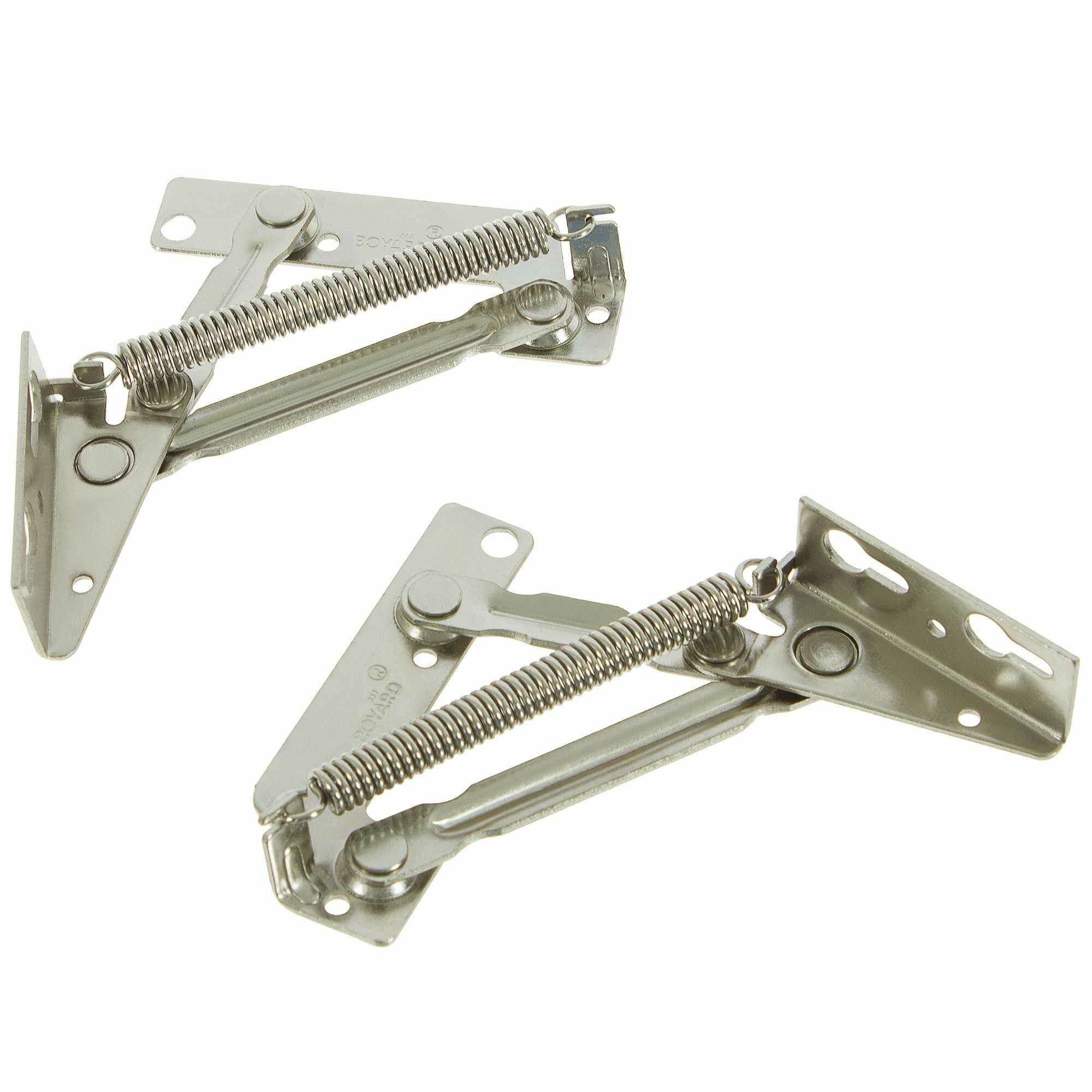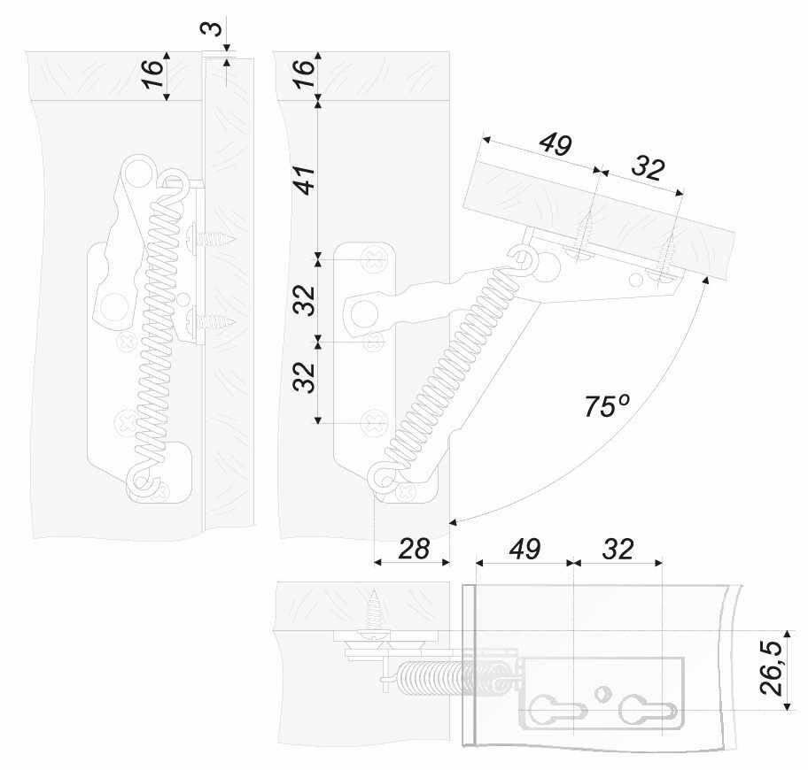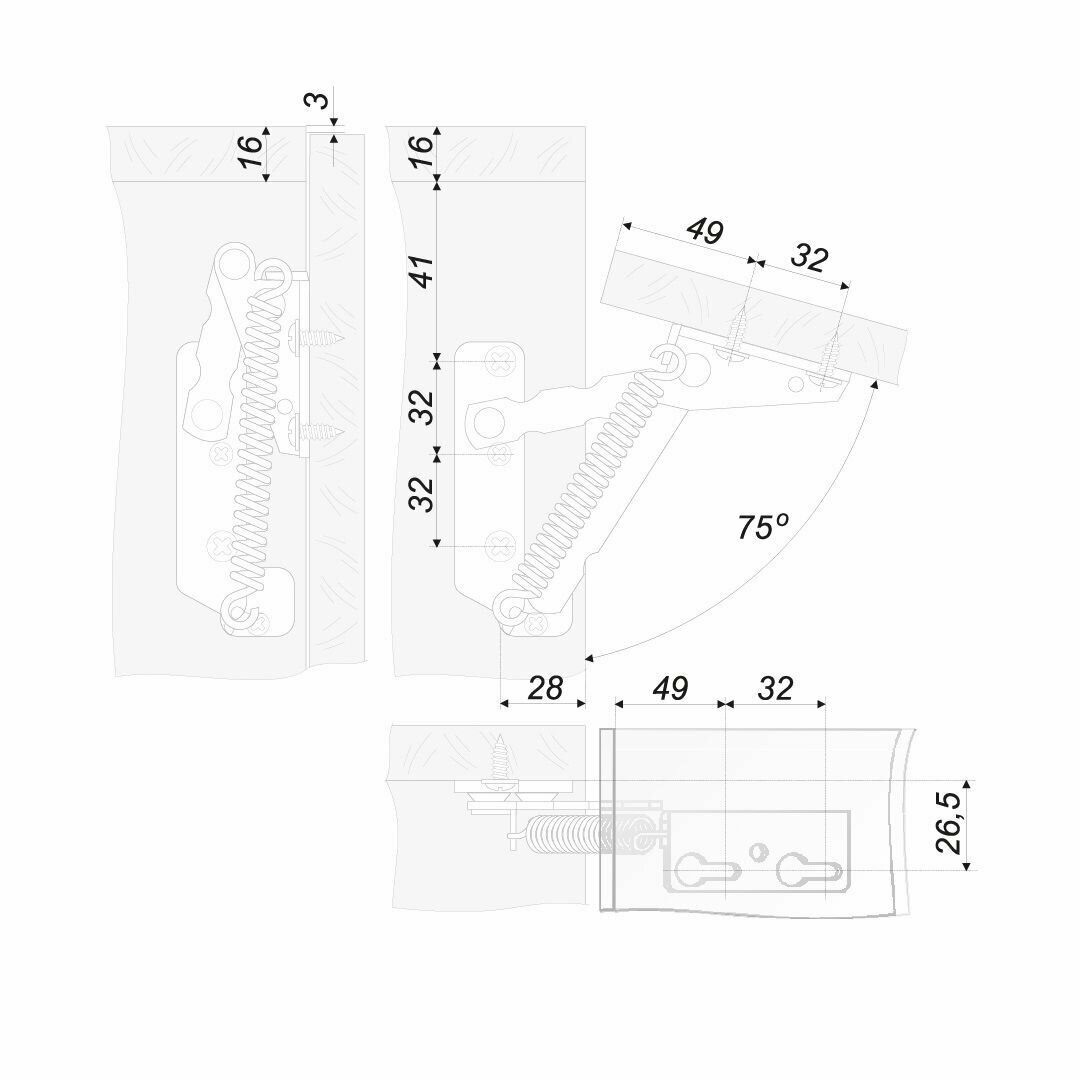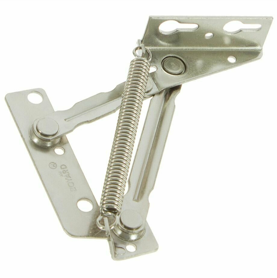 Используется для дверей открывающихся вверх, угол открывания 75 градусов. Конструкция снабжена пружиной, за счет которой дверь открывается и фиксируется в закрытом и открытом положении.