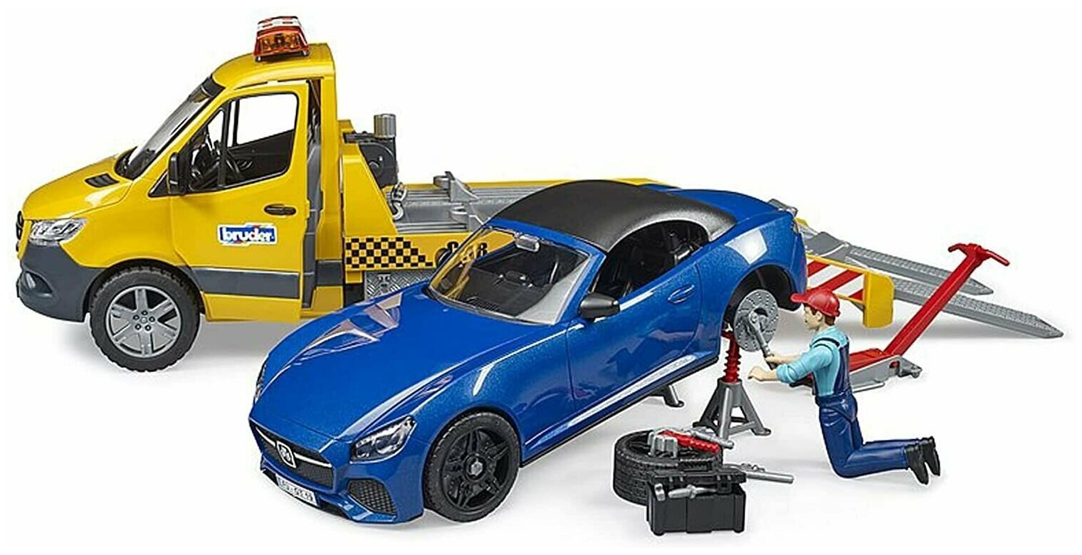 Игрушка от бренда Bruder 02-675 Автотранспортер Mercedes-Benz Sprinter несомненно понравится вашему ребенку. Современный дизайн производит впечатление при первом знакомстве. Новая модель отличается новой кабиной с другой подсветкой, совершенно другими колесами и звуковым модулем. Транспортное средство, перевозимое на эвакуаторе, также изменилось, и это синий родстер. Набор состоит из двух автомобилей: эвакуатор MB Sprinter и синий родстер. Навесная подвеска увеличит возможности погрузки и сохранность перевозимых грузов. Дверь кабины открывается, и фигурка помещается на место водителя или пассажира. Фигурка в комплект не входит. В передней части эвакуатора есть адаптер, к которому можно прикрепить дополнительное оборудование, чтобы добавить веселью новое измерение. С другой стороны, в задней части кабины эвакуатора находится тросовая лебедка, которая наматывается и разматывается с помощью ручки, расположенной рядом с барабаном, на который наматывается трос. Благодаря этой лебедке можно загружать и перевозить автомобили даже в самых сложных ситуациях. Перед загрузкой автомобиля на прицеп необходимо выдвинуть задние аппарели. Автомобиль дополнительно фиксируется противооткатными упорами. Когда они нам больше не нужны, а мы хотим иметь их под рукой, достаточно хранить их в ящиках для инструментов, а аппарели также можно вставить прямо в шасси. Открывающиеся ящики для инструментов прикреплены к левой и правой сторонам платформы. Синий родстер добавляет очарования всему набору. В автомобиле открывается открывающаяся крыша, и в нем есть место для фигурки Bworld. Для еще большего удовольствия автомобиль оснащен новой системой замены колес, поэтому ребенок может играть роль механика и заменять колеса в случае поломки. Все колеса можно снять, чтобы их можно было отремонтировать или полностью заменить на новые. Для этого вам понадобится баллонный ключ, который спрятан в шасси. Звуковой модуль расположенными на крыше автомобиля, управляется с помощью 4 кнопок, которые издают звук 3 разных аварийных сирен (скорой помощи, пожарной охраны и полиции) и звук запуска двигателя. Все звуки сопровождаются световыми эффектами. Вы можете выключить свет и звук, снова нажав кнопку или подождав около 20 секунд, пока они не отключатся сами по себе. Кроме того, эвакуатор оснащен мягкими покрышками с профилированным протектором, которые позволяют использовать игрушку не только дома, но и на улице.