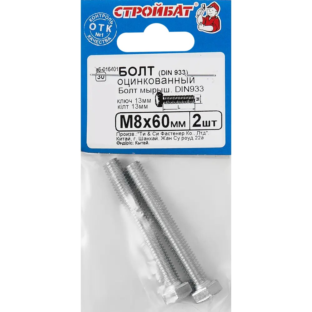 Болт Стройбат оцинкованный DIN 933 М8 х 60 2 штуки