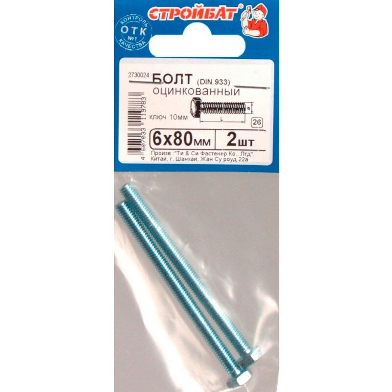 Болт Стройбат оцинкованный DIN 933 М6 х 80 2 штуки