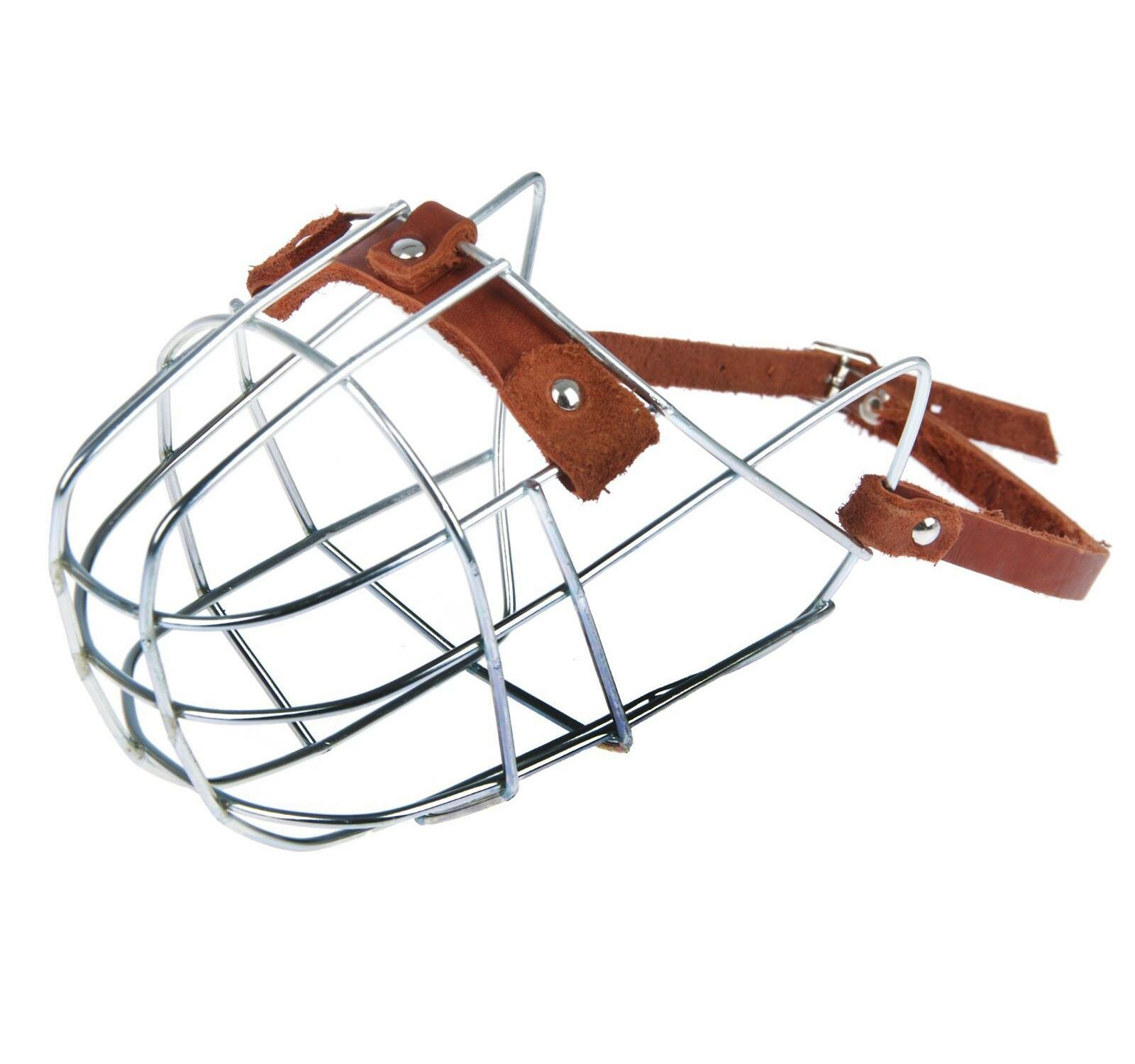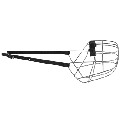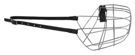 Прочный, надежный намордник для собаки , изготовленный из металла. Намордник имеет мягкую кожаную подкладку в верхней части.