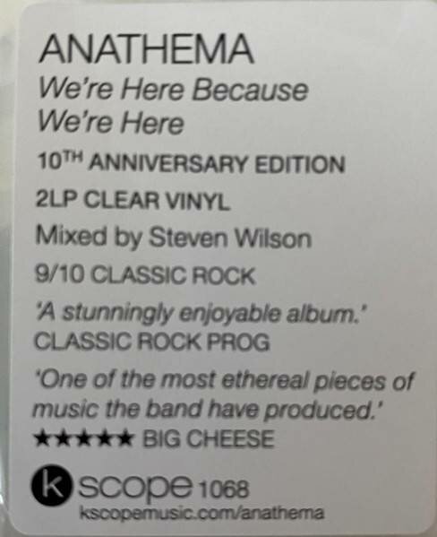 Were Here Because Were Here - восьмой студийный альбом британской рок-группы Anathema, выпущенный в 2010 году. Диск стал первым релизом группы на лейбле Kscope и ознаменовал собой значительный отход от раннего звучания дум-метала, перейдя к более прогрессивному и атмосферному рок-стилю. Anathema - английская рок-группа из Ливерпуля. Команда была образована в 1990 году Винсентом и Дэниелом Кавана, басистом Джейми Кавана, барабанщиком/клавишником Джоном Дугласом и вокалистом Дарреном Уайтом. На протяжении всей своей карьеры группа вела активный концертный график. Впервые они гастролировали в 1992 году с американской дэт-метал группой Cannibal Corpse, с тех пор ребята выступали по всей Европе, США, Центральной Америке, Австралии, Новой Зеландии, Индии и Турции. На последних этапах своей карьеры группа выступала на таких известных площадках, как лондонская O2 Arena, Wembley Arena и London Palladium, а также появилась на сцене вместе со Стивеном Хокингом на Starmus Festival. Anathema выпустила 11 студийных альбомов, включая «Distant Satellites» (2014), в который вошла песня Anathema, названная гимном года на третьей ежегодной церемонии Progressive Music Awards. Три года спустя альбом «The Optimist» был назван альбомом года на Progressive Music Awards.