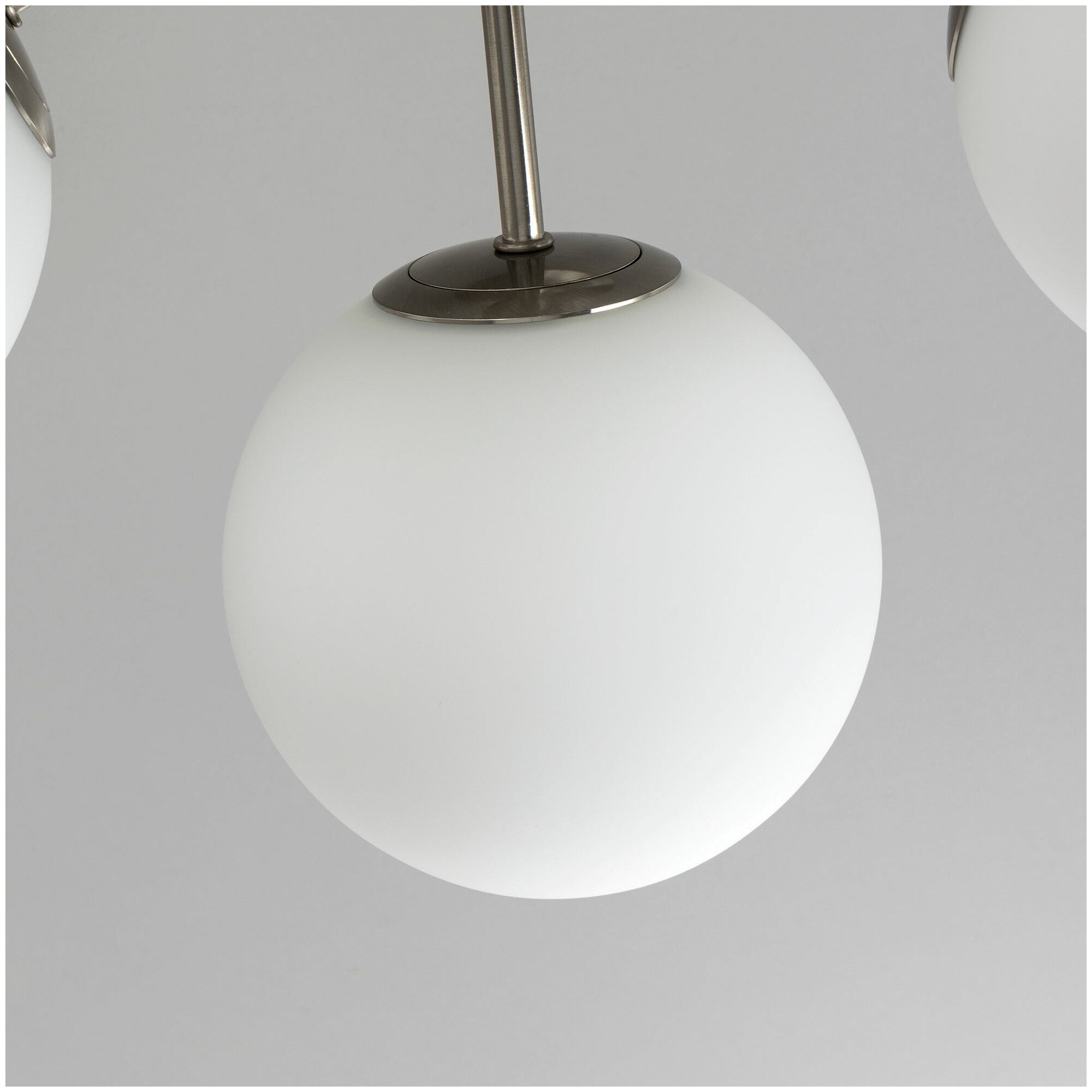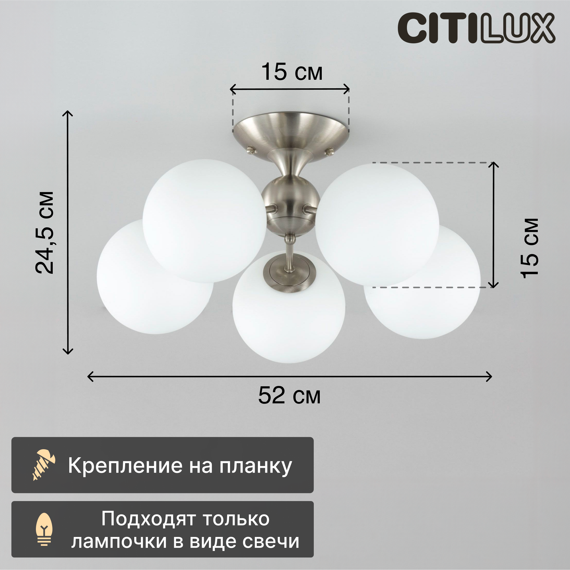 Потолочная люстра Citilux Томми CL102154 для интерьеров, оформленных в современном стиле. Корпус металлический, цвет матовый хром. Плафоны стеклянные, в форме шара, цвет белый матовый. В изделии 5 ламп с цоколем Е14, максимальной мощностью для ламп накаливания 40Вт. Светодиодные лампы можно использовать более яркие. Площадь освещения около 12м². Модель подходит для всех типов потолков, в том числе натяжных. Тип крепления-планка.