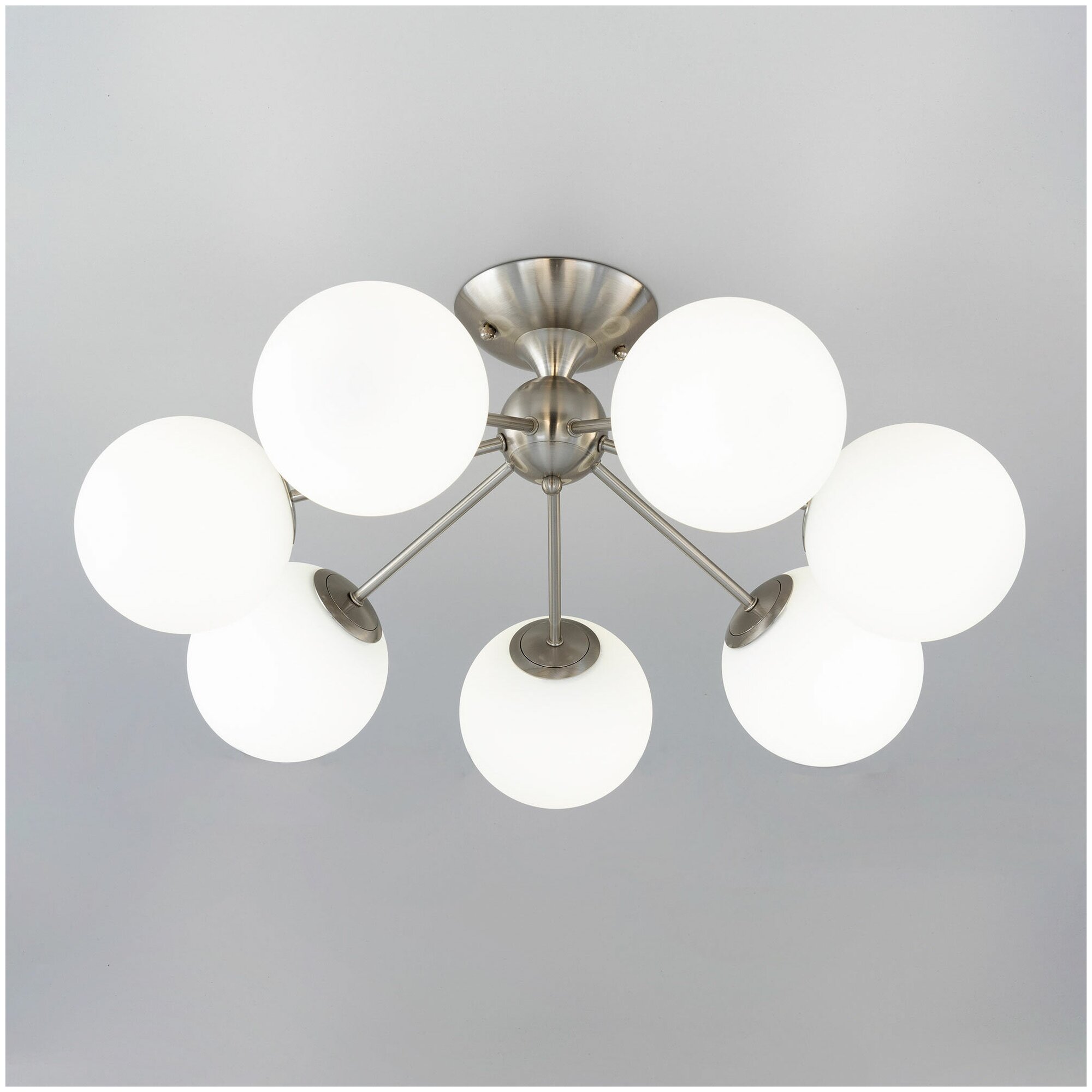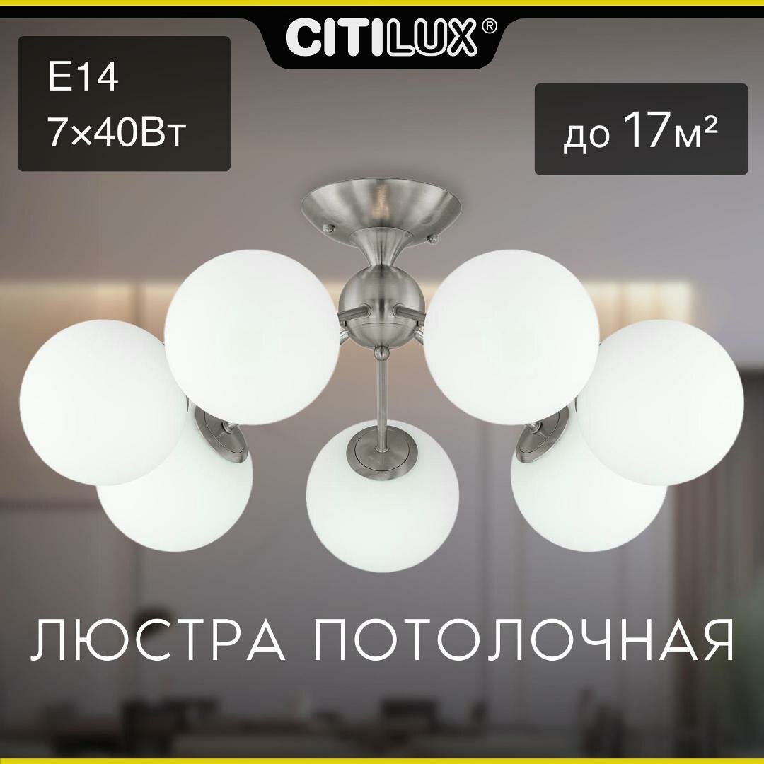 Потолочная люстра Citilux Томми CL102174 для интерьеров, оформленных в современном стиле. Корпус металлический, цвет матовый хром. Плафоны стеклянные, в форме шара, цвет белый матовый. В изделии 7 ламп с цоколем Е14, максимальной мощностью для ламп накаливания 40Вт. Светодиодные лампы можно использовать более яркие. Площадь освещения около 17м². Модель подходит для всех типов потолков, в том числе натяжных. Тип крепления-планка.