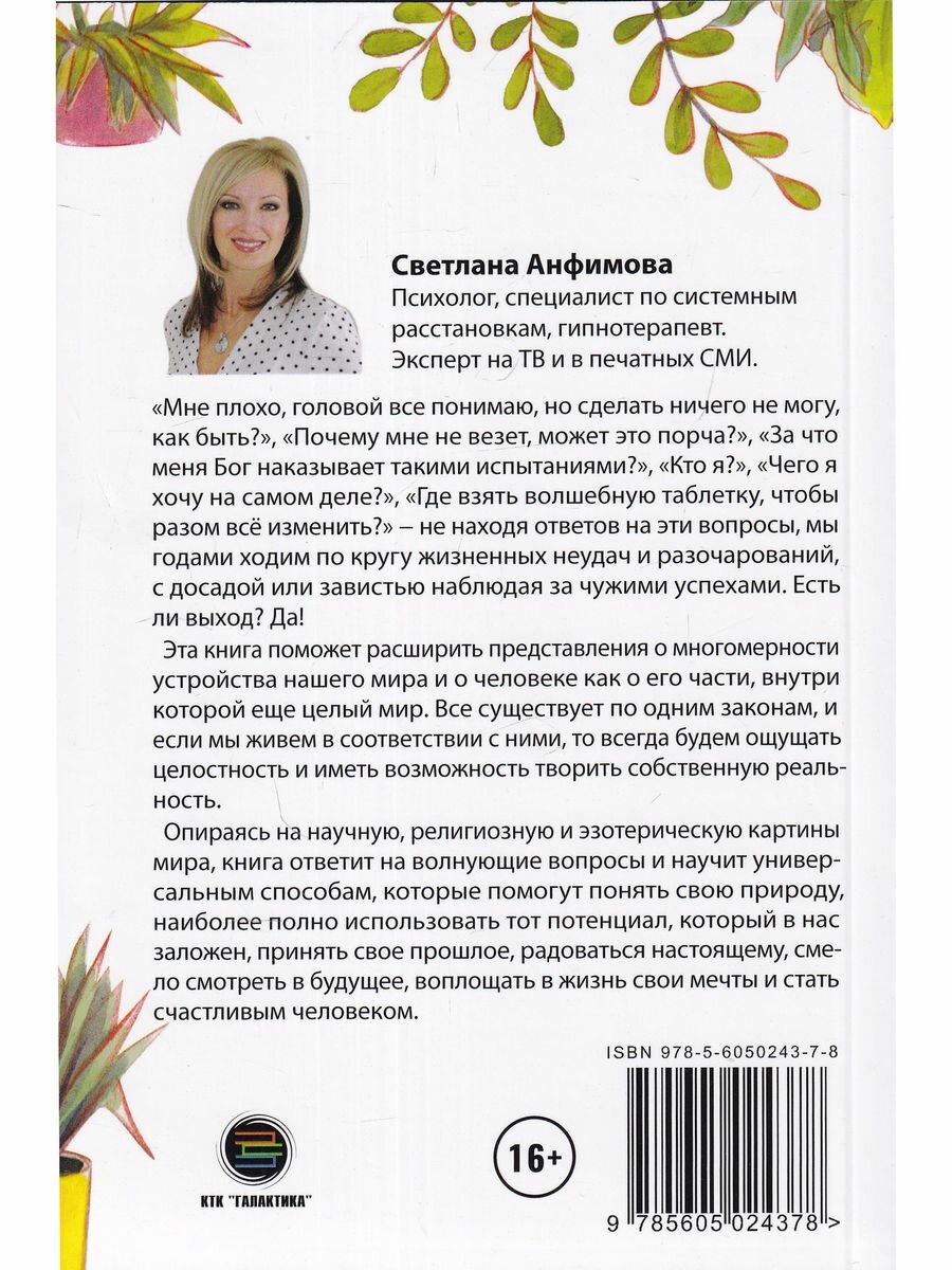 Опираясь на научную, религиозную и эзотерическую картины мира, книга ответит на волнующие вопросы и научит универсальным способам, которые помогут понять свою природу, наиболее полно использовать тот потенциал, который в нас заложен, принять свое прошлое, радоваться настоящему, смело смотреть в будущее, воплощать в жизнь свои мечты и стать счастливым человеком.