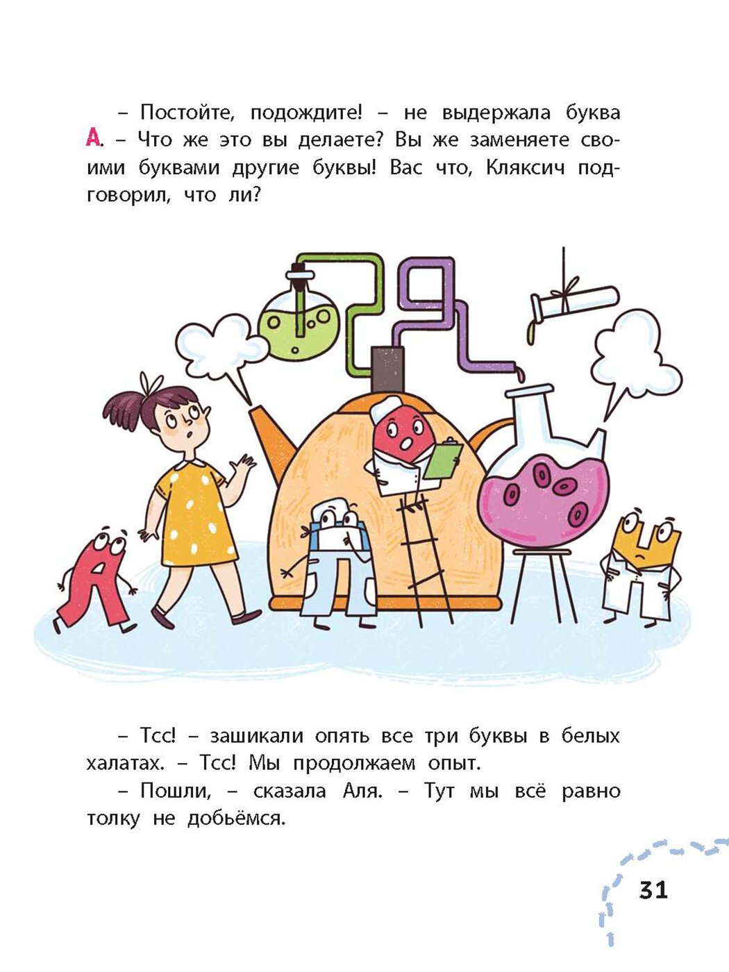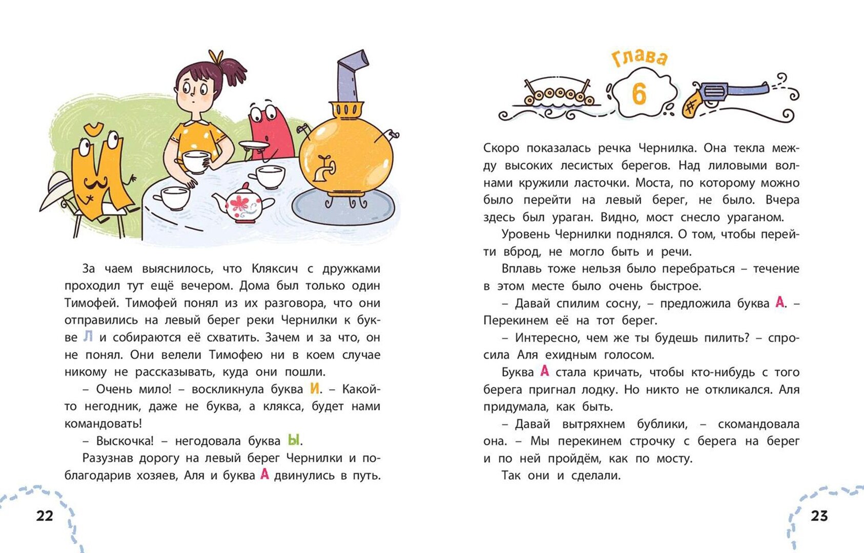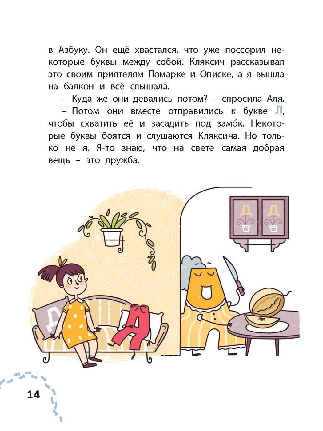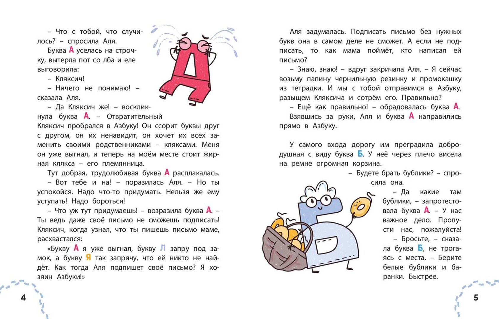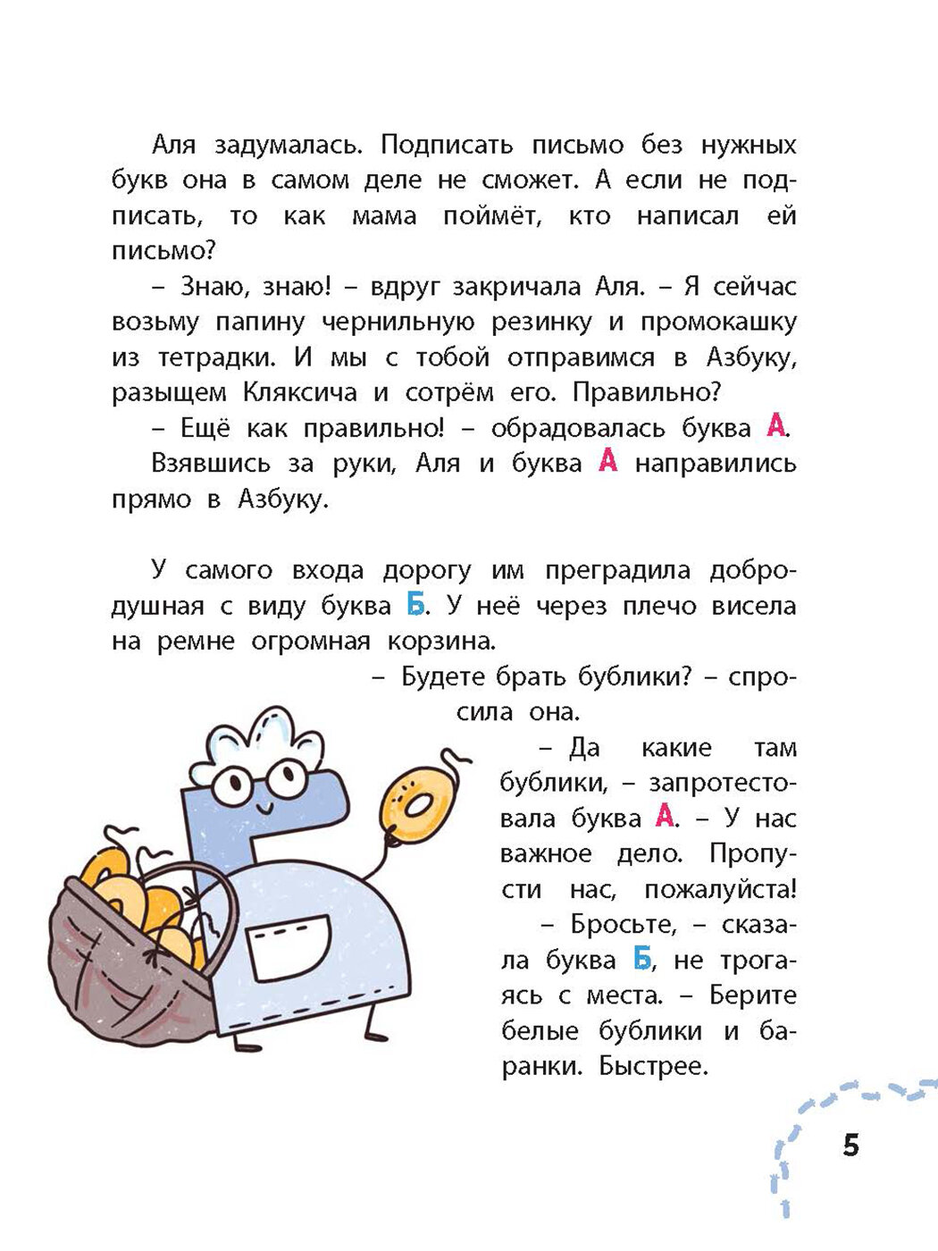 Девочка Аля решила написать любимой маме письмо, но буквы никак не хотели её слушаться. Что же случилось? Оказалось, это всё проделки злого Кляксича! Чтобы прогнать хулигана, Аля вместе с храброй буквой А отправляется в волшебное путешествие. По дороге ей предстоит познакомиться со всеми жителями Азбуки – буквами от А до Я. Вместе с Алей обязательно подружатся с буквами и юные читатели этой познавательной и поучительной сказки известной детской писательницы Ирины Токмаковой.