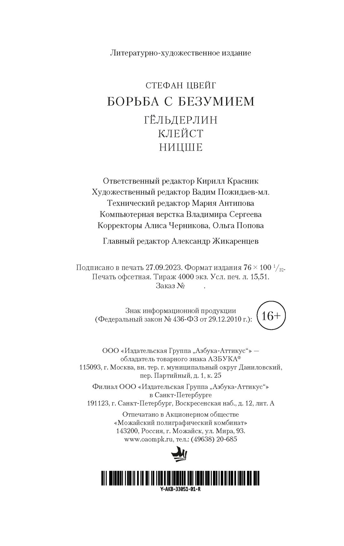 Борьба с безумием. Гёльдерлин. Клейст. Ницше (Цвейг Стефан); Азбука Издательство, 2023
