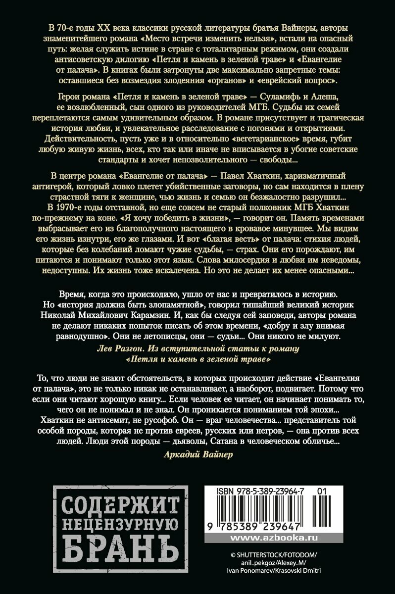 В 70-е годы ХХ века классики русской литературы братья Вайнеры, авторы знаменитейшего романа «Место встречи изменить нельзя», встали на опасный путь: желая служить истине в стране с тоталитарным режимом, они создали антисоветскую дилогию «Петля и камень в зеленой траве» и «Евангелие от палача». В книгах были затронуты две максимально запретные темы: оставшиеся без возмездия злодеяния «органов» и «еврейский вопрос». Герои романа «Петля и камень в зеленой траве» — Суламифь и Алеша, ее возлюбленный, сын одного из руководителей МГБ. Судьбы их семей переплетаются самым удивительным образом. В романе присутствует и трагическая история любви, и увлекательное расследование с погонями и открытиями. Действительность, пусть уже и в относительно «вегетарианское» время, губит любую живую жизнь, всех, кто так или иначе не вписывается в убогие советские стандарты и хочет непозволительного — свободы... В центре романа «Евангелие от палача» — Павел Хваткин, харизматичный антигерой, который ловко плетет убийственные заговоры, но сам находится в плену страстной тяги к женщине, чью жизнь и семью он безжалостно разрушил... В 1970-е годы отставной, но еще совсем не старый полковник МГБ Хваткин по-прежнему на коне. «Я хочу победить в жизни», — говорит он. Память временами выбрасывает его из благополучного настоящего в кровавое минувшее. Мы видим его жизнь изнутри, его же глазами. И вот «благая весть» от палача: стихия людей, которые без колебаний ломают чужие судьбы, — страх. Они его порождают, им питаются и понимают только этот язык. Слова милосердия и любви им неведомы, недоступны. Их жизнь тоже искалечена. Но это не делает их менее опасными...