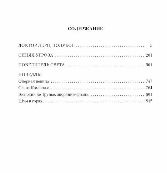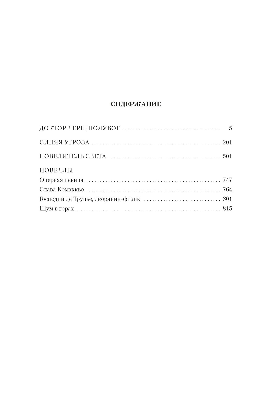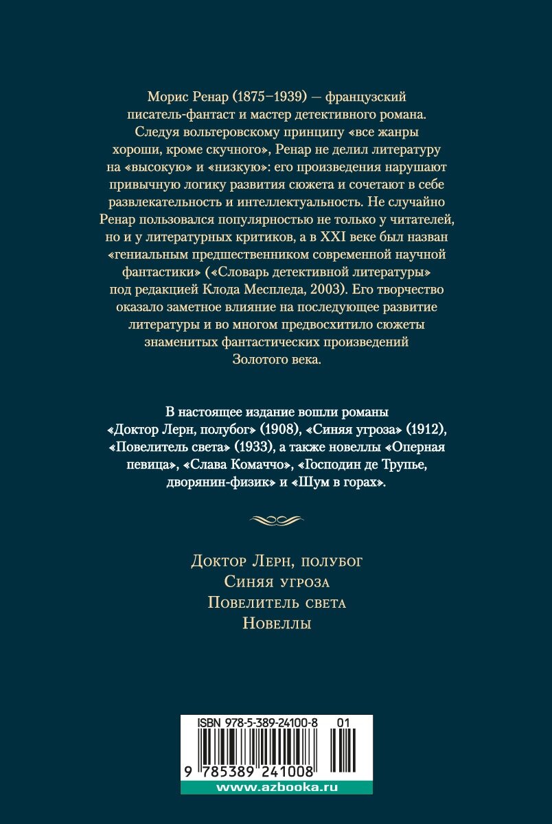 Следуя вольтеровскому принципу «все жанры хороши, кроме скучного», Ренар не делил литературу на «высокую» и «низкую»: его произведения нарушают привычную логику развития сюжета и сочетают в себе развлекательность и интеллектуальность. Не случайно Ренар пользовался популярностью не только у читателей, но и у литературных критиков, а в XXI веке был назван «гениальным предшественником современной научной фантастики» («Словарь детективной литературы» под редакцией Клода Меспледа, 2003). Его творчество оказало заметное влияние на последующее развитие жанровой литературы и во многом предвосхитило сюжеты знаменитых фантастических произведений Золотого века. В настоящее издание вошли романы «Доктор Лерн, полубог» (1908), «Синяя угроза» (1912), «Повелитель света» (1933), а также новеллы «Оперная певица», «Слава Комаккьо», «Господин де Трупье, дворянин-физик» и «Шум в горах».