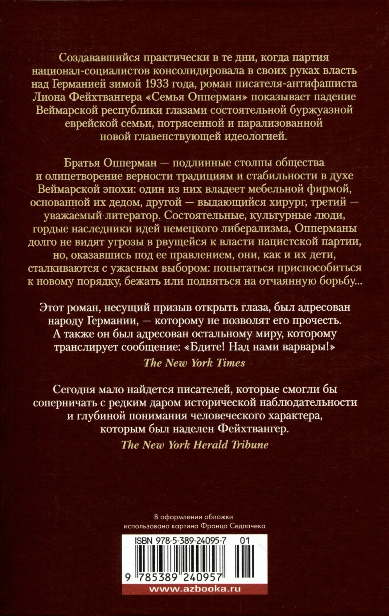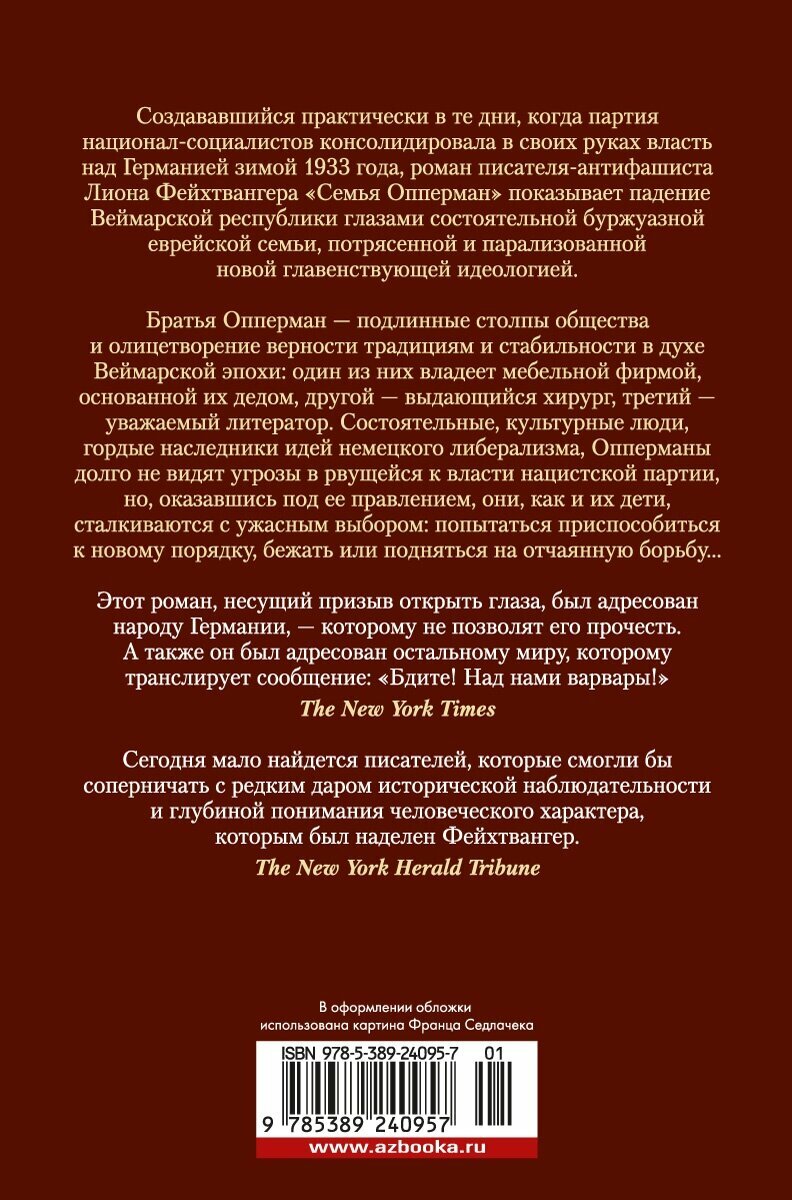 Создававшийся практически в те дни, когда партия национал-социалистов консолидировала в своих руках власть над Германией зимой 1933 года, роман писателя-антифашиста Лиона Фейхтвангера «Семья Опперман» показывает падение Веймарской республики глазами состоятельной буржуазной еврейской семьи, потрясенной и парализованной новой главенствующей идеологией. Братья Опперман — подлинные столпы общества и олицетворение верности традициям и стабильности в духе Веймарской эпохи: один из них владеет мебельной фирмой, основанной их дедом, другой — выдающийся хирург, третий — уважаемый литератор. Состоятельные, культурные люди, гордые наследники идей немецкого либерализма, Опперманы долго не видят угрозы в рвущейся к власти нацистской партии, но, оказавшись под ее правлением, они, как и их дети, сталкиваются с ужасным выбором: попытаться приспособиться к новому порядку, бежать или подняться на отчаянную борьбу...