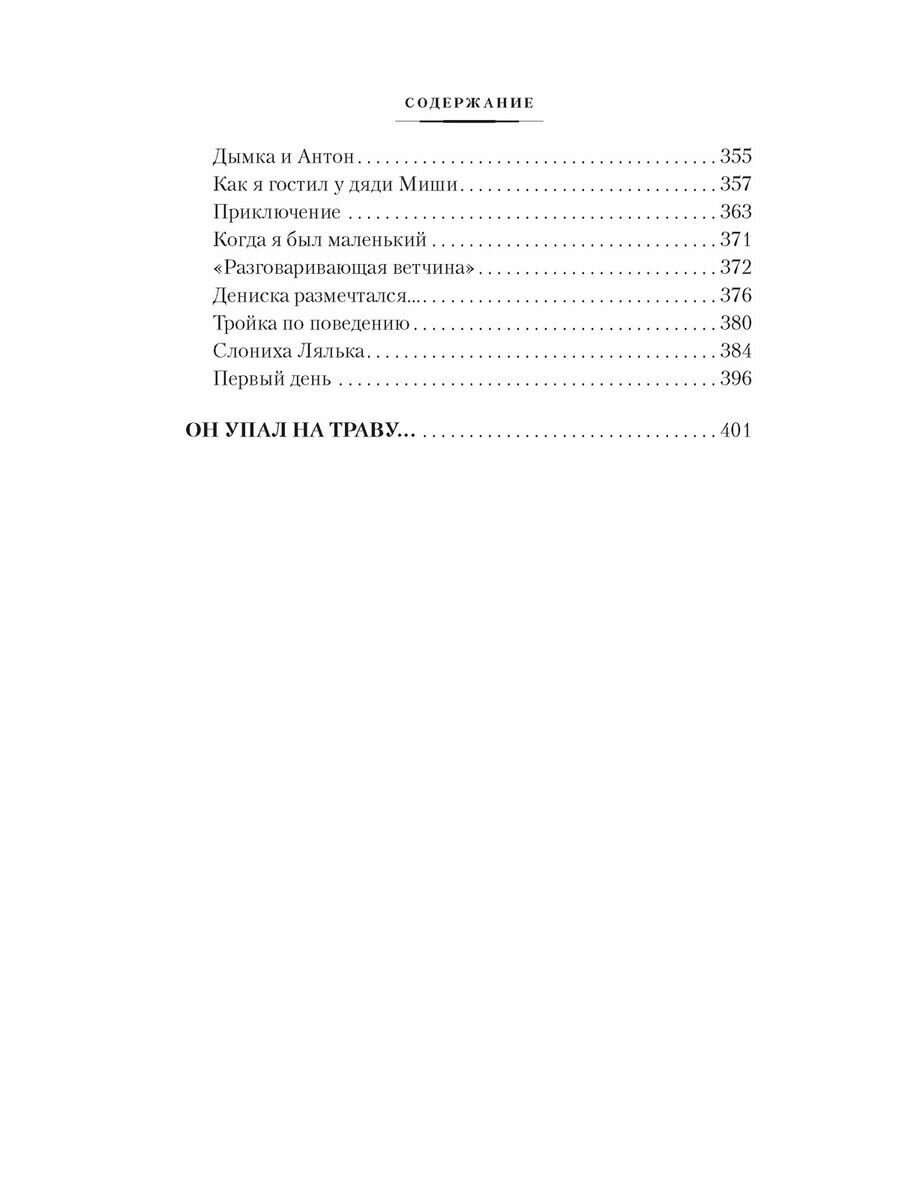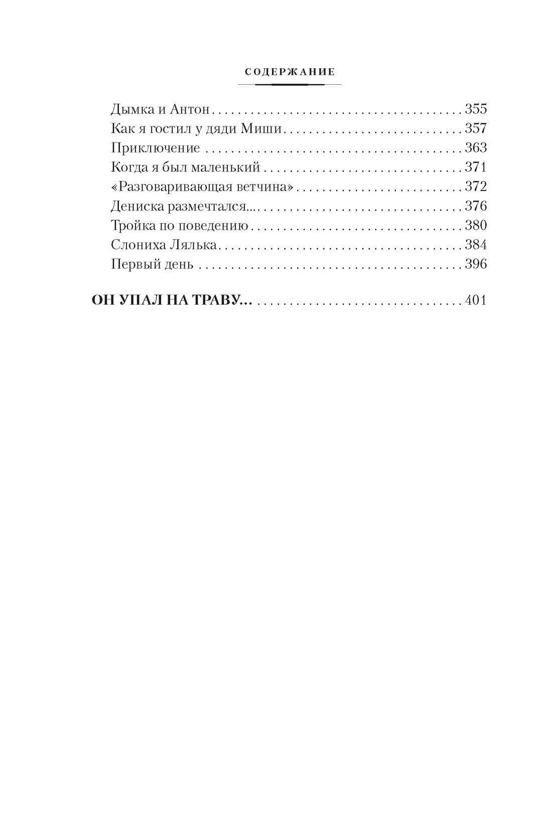 Дениска Кораблёв — самый обычный мальчишка. Ходит в школу, ленится делать уроки, спорит с мамой по пустякам. И как любой мальчишка в его возрасте, не любит скучать. Поэтому каждый день выдумывает что-то новое: то невкусную кашу за окно выльет, а то променяет дорогой игрушечный самосвал на маленького светлячка в спичечном коробке. Таким Дениску сотворил писатель Виктор Драгунский, на весёлых историях которого выросло уже не одно поколение юных читателей. Однако не все знакомы с другим Драгунским, немного грустным и серьёзным. Драгунским, которого юношей не взяли на фронт из-за астмы, но в ком любовь к Родине и желание помогать соотечественникам были так сильны, что он пошёл в ополченцы. Воспоминания о том времени и легли в основу автобиографической повести «Он упал на траву…», также включённой в этот сборник. Персонажей Виктора Драгунского оживил мастер книжной графики Евгений Медведев. В 2014 году он стал лауреатом Премии Президента в области литературы и искусства для детей и юношества. Цикл «Денискины рассказы» впервые публикуется с полным комплектом иллюстраций знаменитого художника.