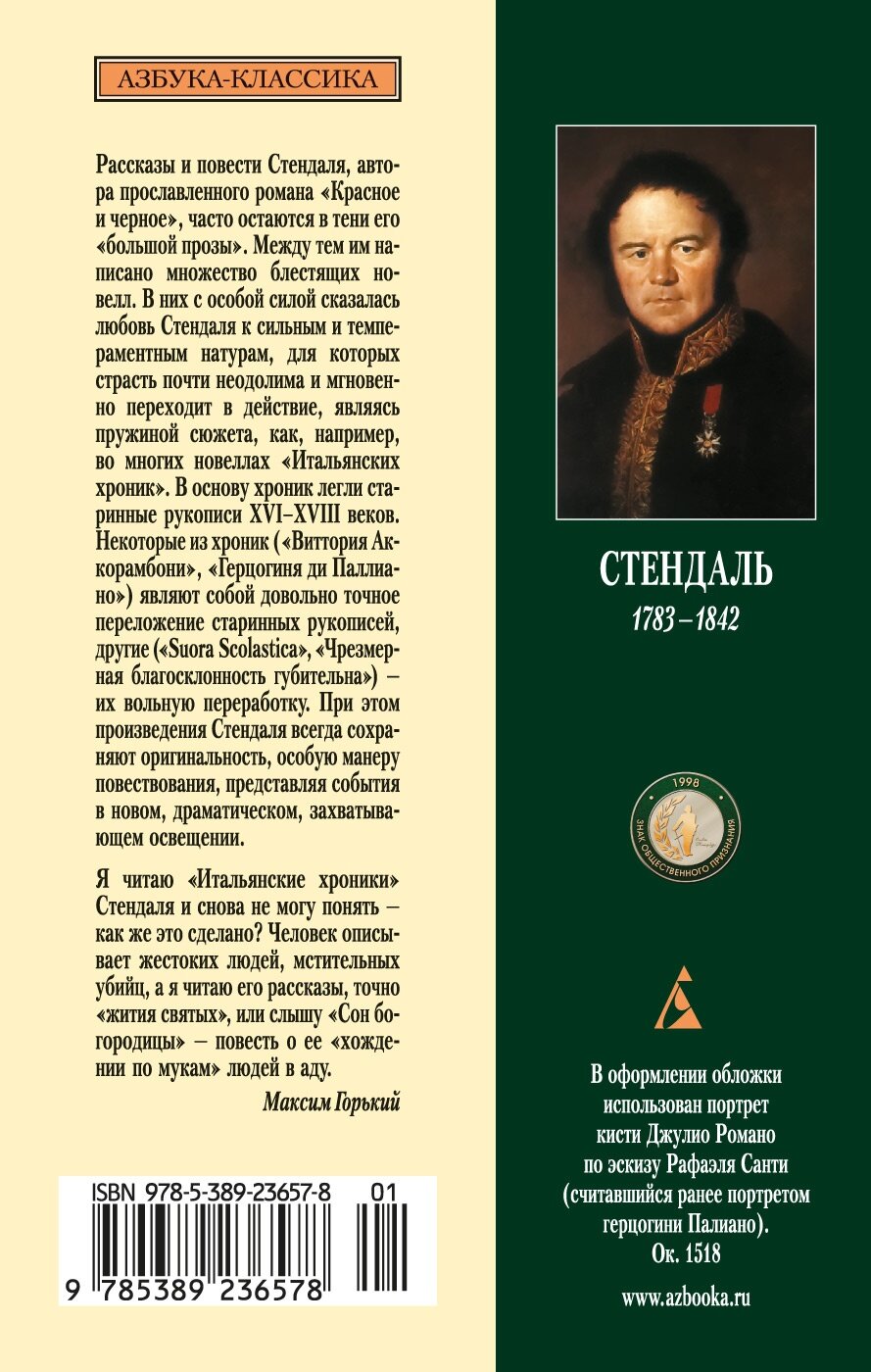 Рассказы и повести Стендаля, автора прославленного романа «Красное и черное», часто остаются в тени его «большой прозы». Между тем им написано множество блестящих новелл, полных движения, с неожиданной, энергичной концовкой. В этих небольших по объему произведениях с особой силой сказалась любовь Стендаля к сильным и темпераментным натурам, для которых страсть почти неодолима и мгновенно переходит в действие, являясь пружиной сюжета, как, например, во многих новеллах «Итальянских хроник», включенных в настоящее издание. В основу хроник легли старинные рукописи XVI–XVIII веков. В большинстве случаев это истории разбойников, заговорщиков и бунтовщиков, с любовью, ревностью и мщением. Некоторые из хроник («Виттория Аккорамбони», «Герцогиня ди Паллиано») являют собой довольно точное переложение старинных рукописей, другие («Suora Scolastica», «Чрезмерная благосклонность губительна») — их вольную переработку. При этом произведения Стендаля всегда сохраняют оригинальность, особую манеру повествования, представляя события в новом, драматическом, захватывающем освещении.