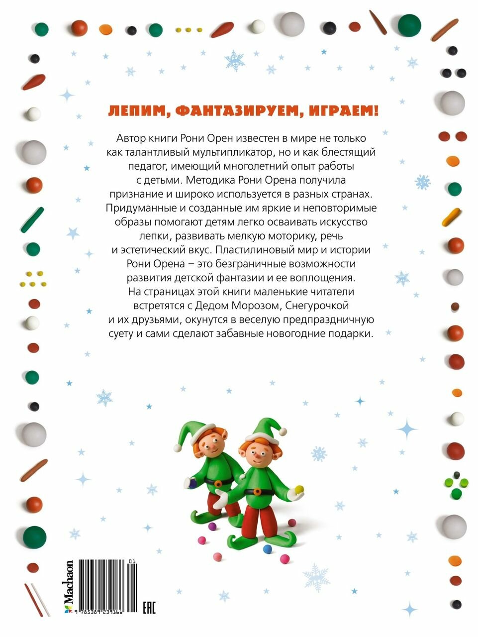 На занятиях Рони Орена, профессора израильской академии искусств «Бецалел», малыши не просто играют, они думают, фантазируют, делают открытия и конечно же учатся любить природу. На страницах этой книги маленькие читатели встретятся с Дедом Морозом, Снегурочкой и их друзьями, окунутся в веселую предпраздничную суету и сами сделают забавные новогодние подарки. Рони Орен – известный художник и педагог. Он иллюстрировал более 30 детских книг. Многочисленные мультипликационные сериалы для детей, выполненные Рони Ореном методом анимации, многократно транслировались по ведущим мировым телеканалам: Би-би-си, «Уолт Дисней», 4-й британский канал и др.