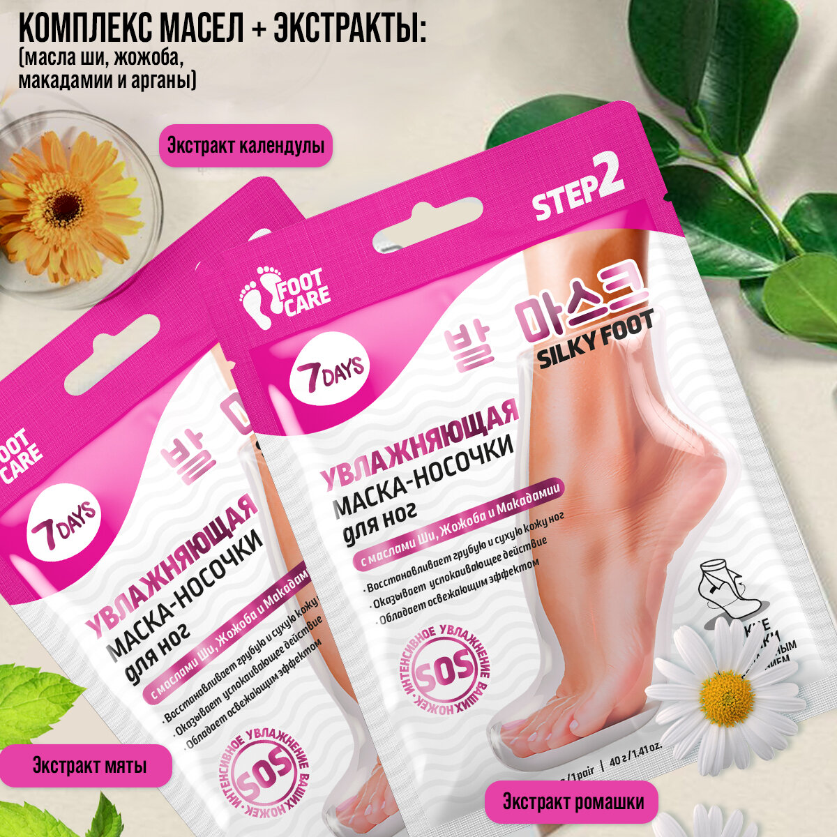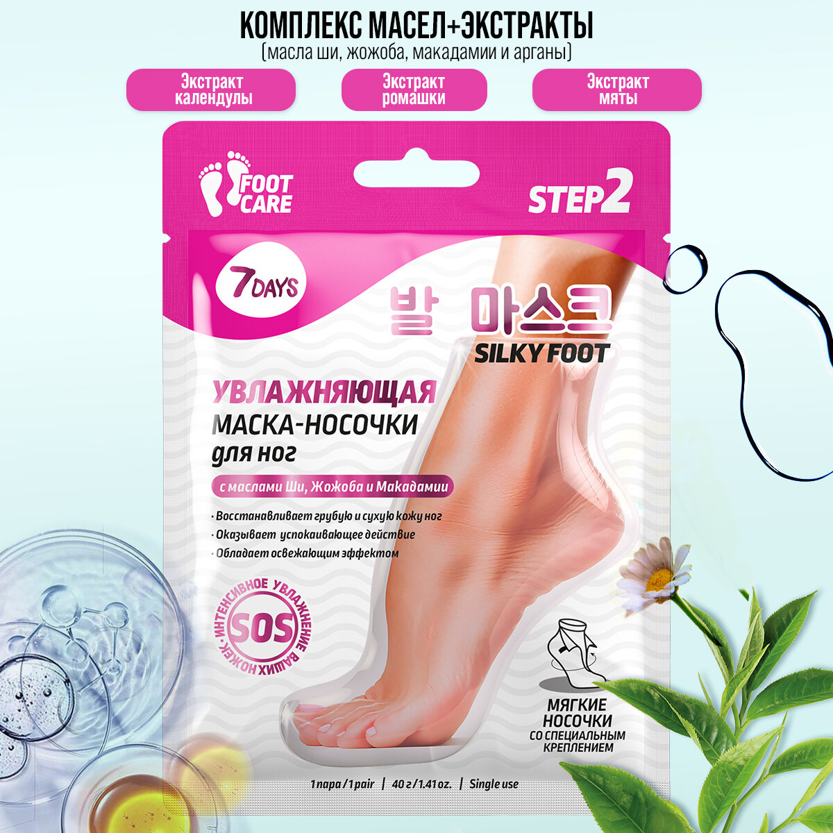 Увлажняющая маска-носочки содержит комплекс натуральных масел: Ши, Жожоба, Макадамии и Арганы, которые интенсивно увлажняют, питают, смягчают и восстанавливают сухую кожу ножек, значительно улучшая ее внешний вид. Экстракты Календулы, Ромашки и Мяты обладают антибактериальным, успокаивающим и освежающим действием, избавляют от чувства усталости и тяжести.