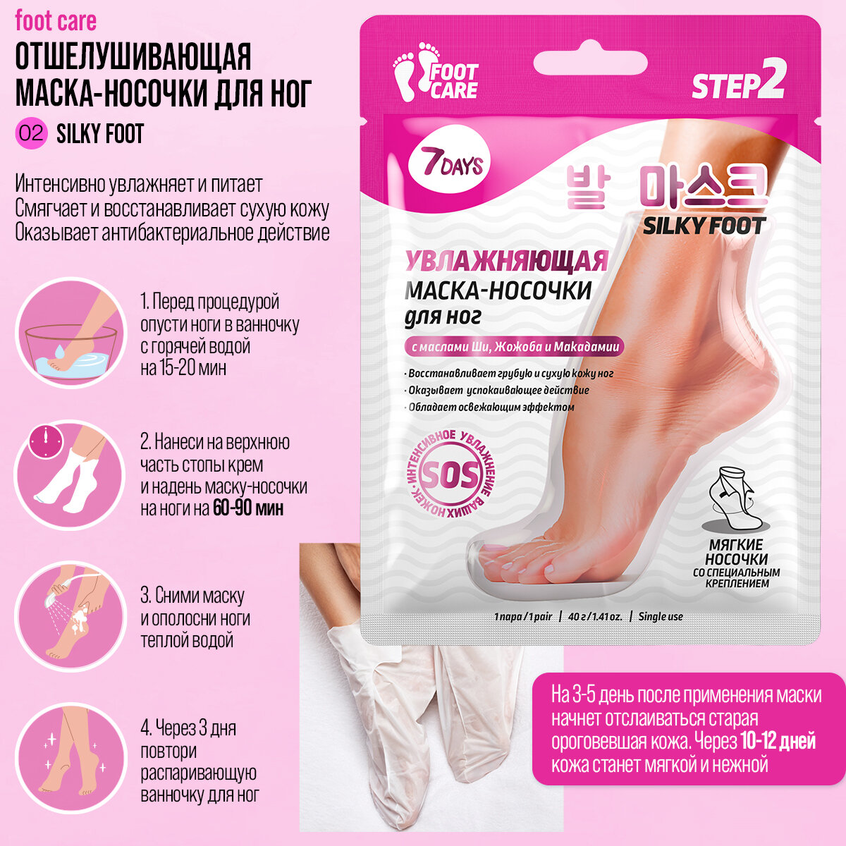 | Способ применения | Перед процедурой на 15-20 минут опусти ноги в ванночку с горячей водой. 2. Нанеси на верхнюю часть стопы плотный питательный крем. 3. Надень маску-носочки на ноги, зафиксируй и оставь на 60 минут. 4. Сними маску и ополосни ноги теплой водой. 5. Через 3 дня повтори распаривающую ванночку для ног (15-20 минут). На 3-5 день после применения маски начнет отслаиваться старая ороговевшая кожа, этот процесс будет продолжаться в течение недели. Через 10-12 дней после применения маски кожа станет мягкой и нежной, как у младенца, и будет радовать тебя на протяжении 2-3 месяцев. |