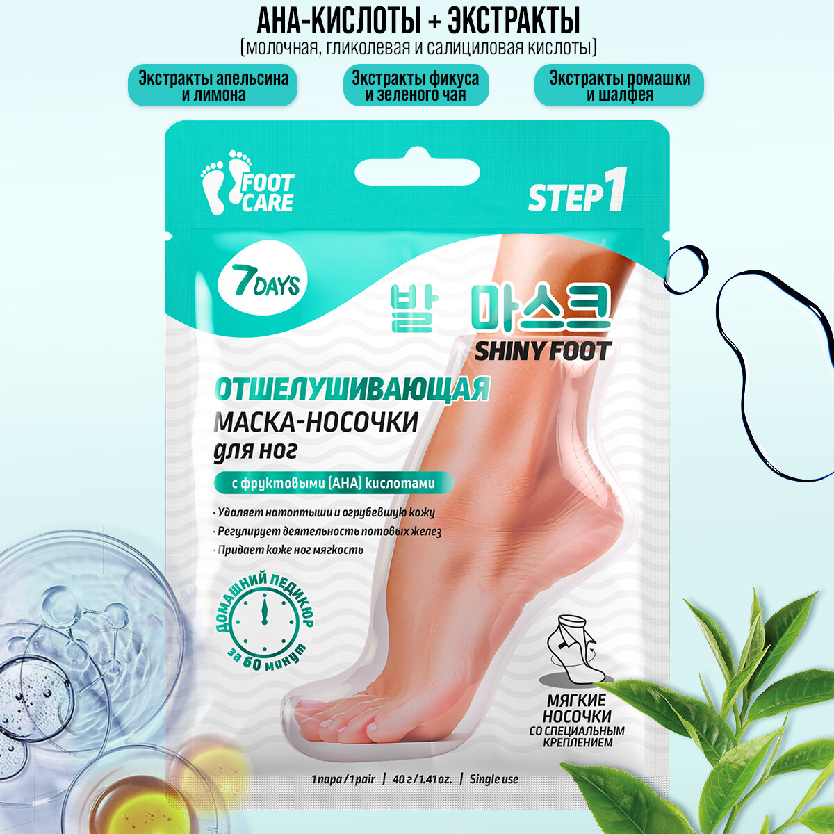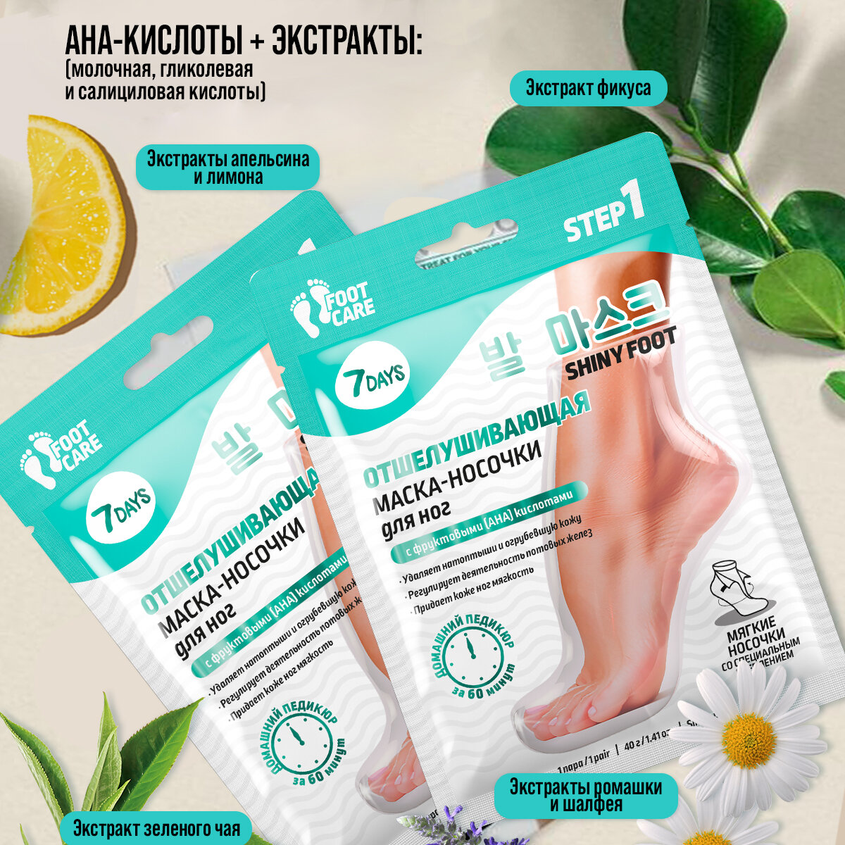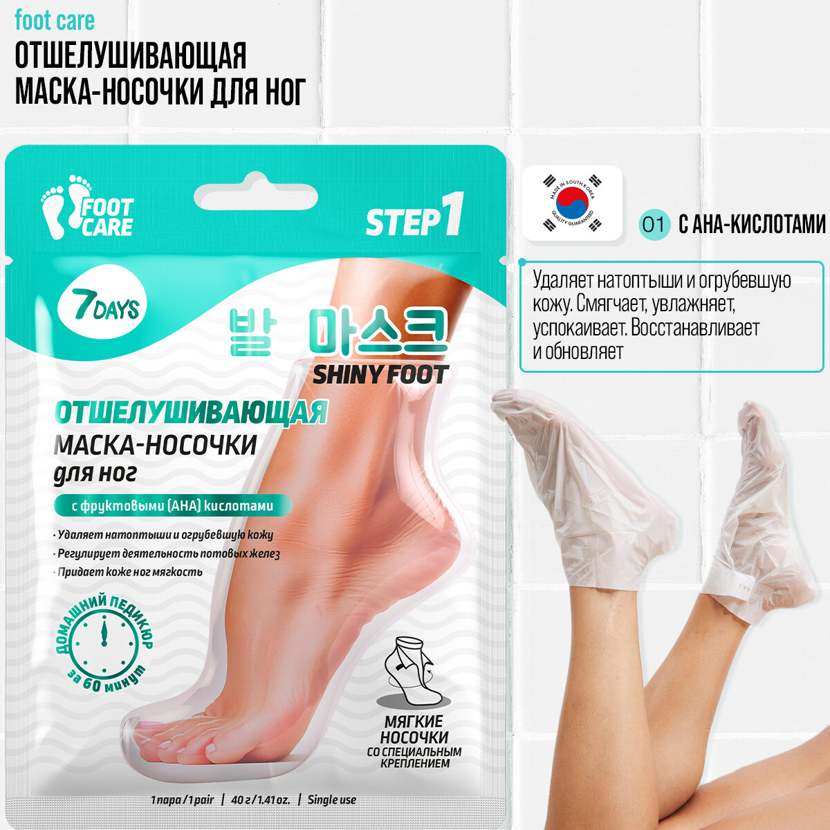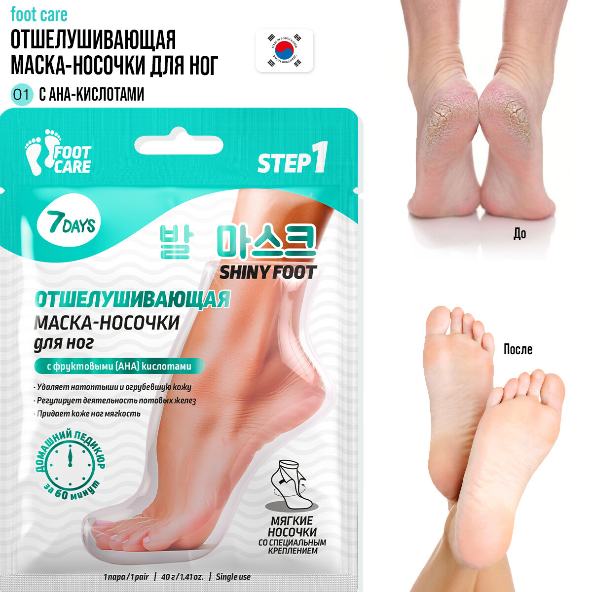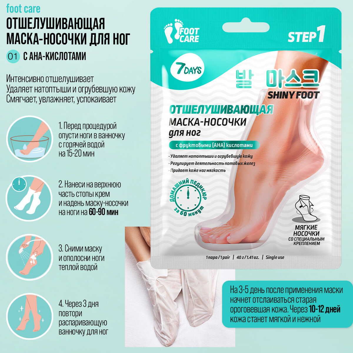 | Способ применения | Перед процедурой на 15-20 минут опусти ноги в ванночку с горячей водой. 2. Нанеси на верхнюю часть стопы плотный питательный крем. 3. Надень маску-носочки на ноги, зафиксируй и оставь на 60 минут. 4. Сними маску и ополосни ноги теплой водой. 5. Через 3 дня повтори распаривающую ванночку для ног (15-20 минут). На 3-5 день после применения маски начнет отслаиваться старая ороговевшая кожа, этот процесс будет продолжаться в течение недели. Через 10-12 дней после применения маски кожа станет мягкой и нежной, как у младенца, и будет радовать тебя на протяжении 2-3 месяцев. |