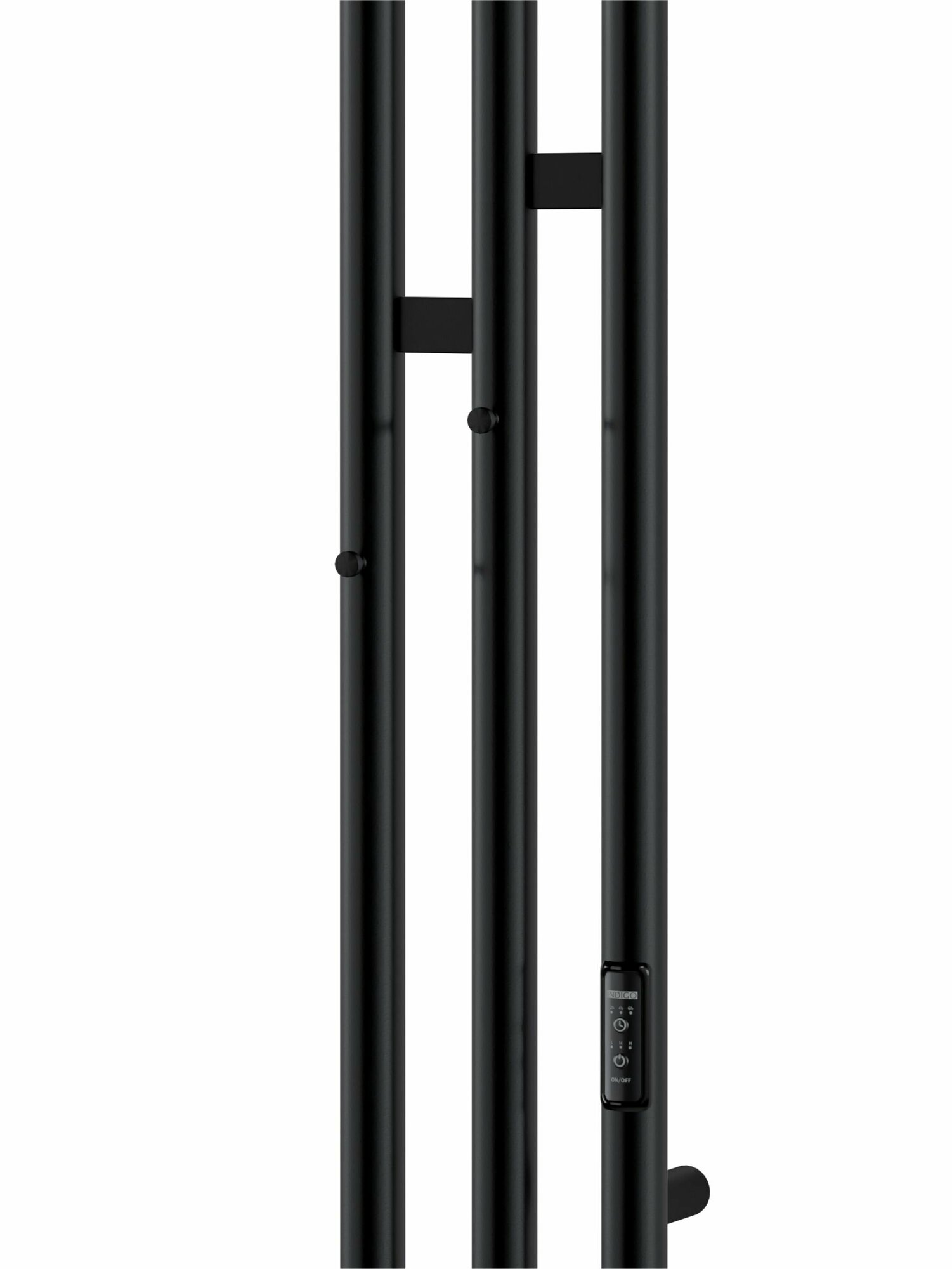 Электрический полотенцесушитель INDIGO Sky - это настоящая находка для тех, кто ценит комфорт и гигиену в ванной комнате! Он не только обеспечивает сухость и тепло полотенец и халатов, но и создает благоприятный микроклимат в душевой, улучшая циркуляцию воздуха и снижая уровень влажности.А еще он просто потрясающе выглядит! Уникальный дизайн, состоящий из трех круглых вертикальных стоек диаметром 32 мм, асимметрично соединенных прямоугольными перекладинами, придаст вашей ванной комнате современный вид. Полотенцесушитель черный матовый покрыт безопасным порошковым полимером, что делает его устойчивым к повреждениям и облегчает уход за ним. Матовое покрытие с легкой песочной текстурой исключает следы от отпечатков пальцев, а черный цвет создаёт эффектный контраст и идеально сочетается с остальной сантехникой темных оттенков. Крючки на полотенцесушителе предусмотрены для размещения вещей. Сушилка для белья настенная занимает минимальное пространство и подходит для любого стиля интерьера. Чистый линейный дизайн поможет зонировать пространство, чтобы внести в интерьер ванной эстетичный вид и завершенность.Но это еще не все! Энергопотребление всего 138 ватт. Сушитель для халатов и полотенец расходует энергии не больше лампочки. Панель управления с терморегулятором и таймером позволяет контролировать температуру и экономить электроэнергию.И самое главное - это устройство безопасно для круглосуточного использования во влажной среде, благодаря защитному классу IP44. Его можно установить как вертикально, так и горизонтально на стену, а все необходимые материалы для установки уже в комплекте. Включается прибор в розетку съемным метровым электрошнуром с вилкой. Также через модуль скрытого подключения можно спрятать электропроводку в стену. Модуль уже включён в сборку. И да, полотенцесушитель электрический застрахован имеет гарантию на 3 года!Для безопасной транспортировки электросушилка для белья упаковывается в коробку из пятислойного картона и защищается вспененным полистиролом. Если вы хотите создать идеальную ванную комнату с максимальным комфортом и стилем, то узкий полотенцесушитель INDIGO Sky - это именно то, что вам нужно! Стильный аксессуар для вашего дома, который будет радовать вас каждый день!