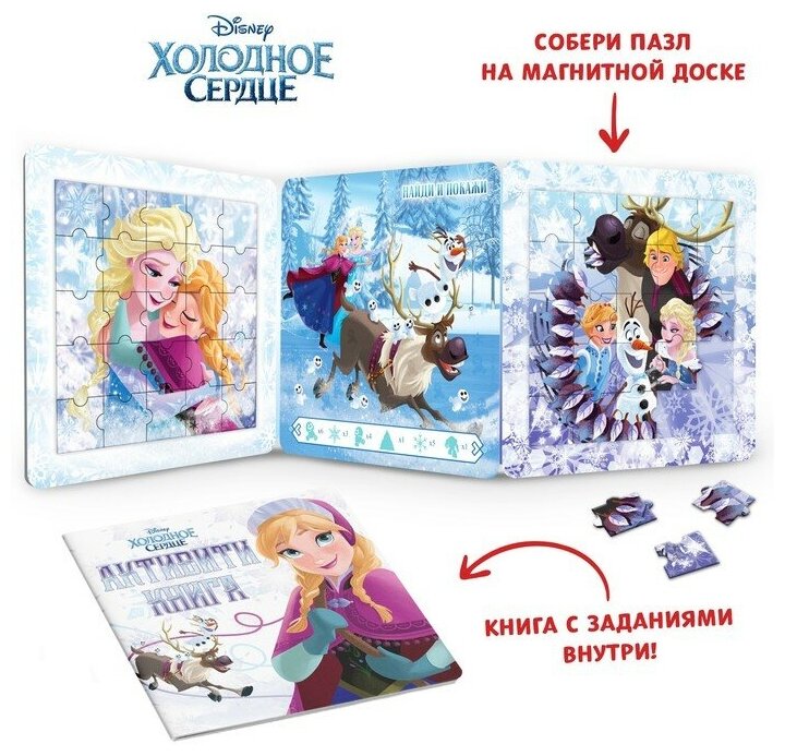 Подарочный набор: Магнитная книга с заданиями + пазлы + настольная игра "Зимнее волшебство", Холодное сердцеУдивительная книга с магнитными пазлами, настольной игрой, увлекательными заданиями и дополнительными магнитными фигурками точно не оставит равнодушным ни одного ребёнка!Ощутите зимнее волшебство вместе с героями "Холодного сердца"! Соберите 2 чудесных магнитных пазла, сыграйте в настольную игру всей семьёй и выполните все задания!В наборе магнитная книга-раскладушка с 2 магнитными пазлами и настольной игрой до 4 игроков, фишки для игры, книга с заданиями, а также дополнительные магниты с любимыми персонажами. В дальнейшем все пазлы и магниты можно использовать как внутри книги, так и на любой металлической поверхности.Состав: Бумага, картон, магнитная лента, металл