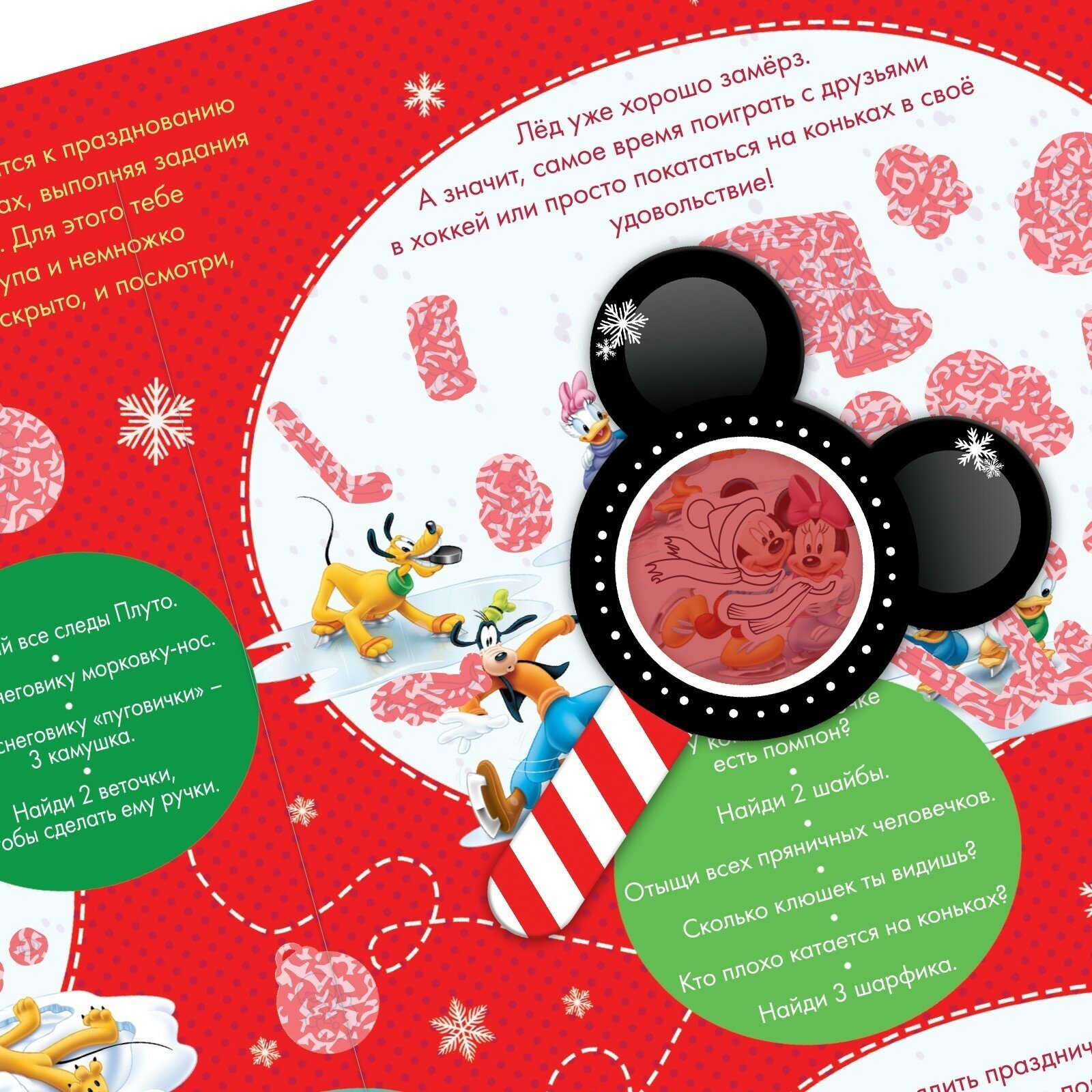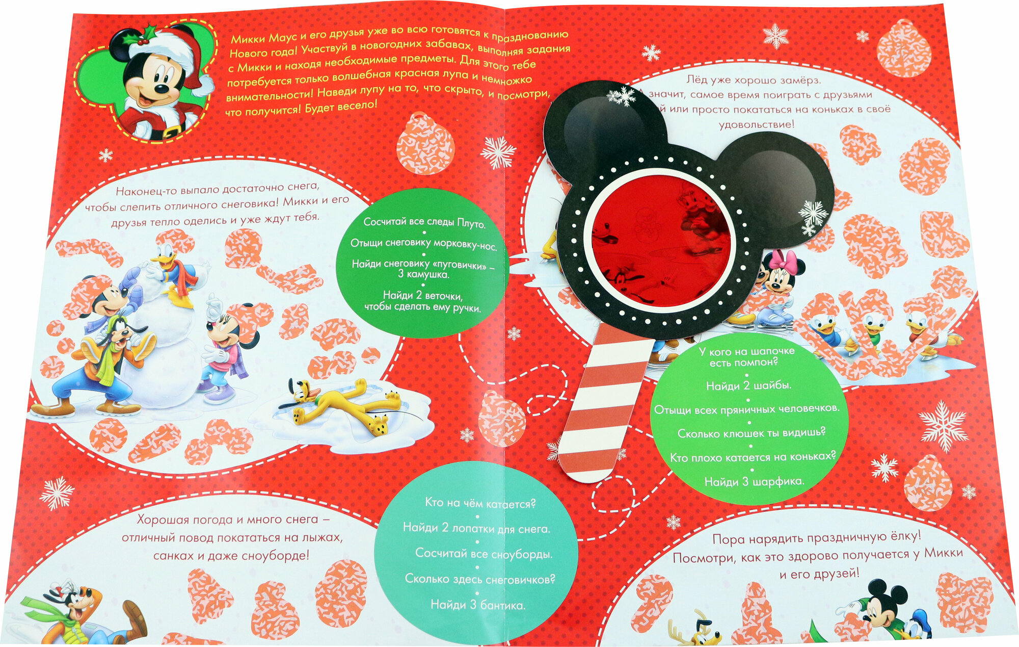 Большой чудесный плакат с увлекательными заданиями таит в себе множество секретов. Откройте их все с помощью волшебной красной лупы и создайте атмосферу зимнего торжества вместе с любимым Микки Маусом и его друзьями!Наведите лупу на красные участки плаката и узнайте, что там скрывается.