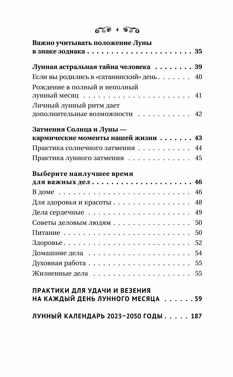 В книге вы найдете информацию о каждом лунном дне до 2050 года! Вычислите, в какие дни Луна покровительствует вашим начинаниям, какие обстоятельства в определенный день могут помешать вашим делам.