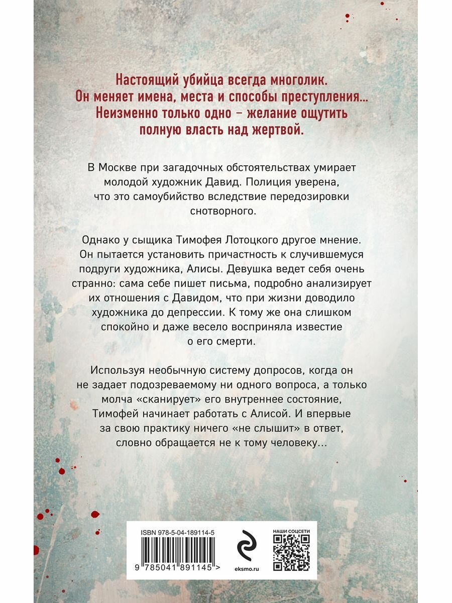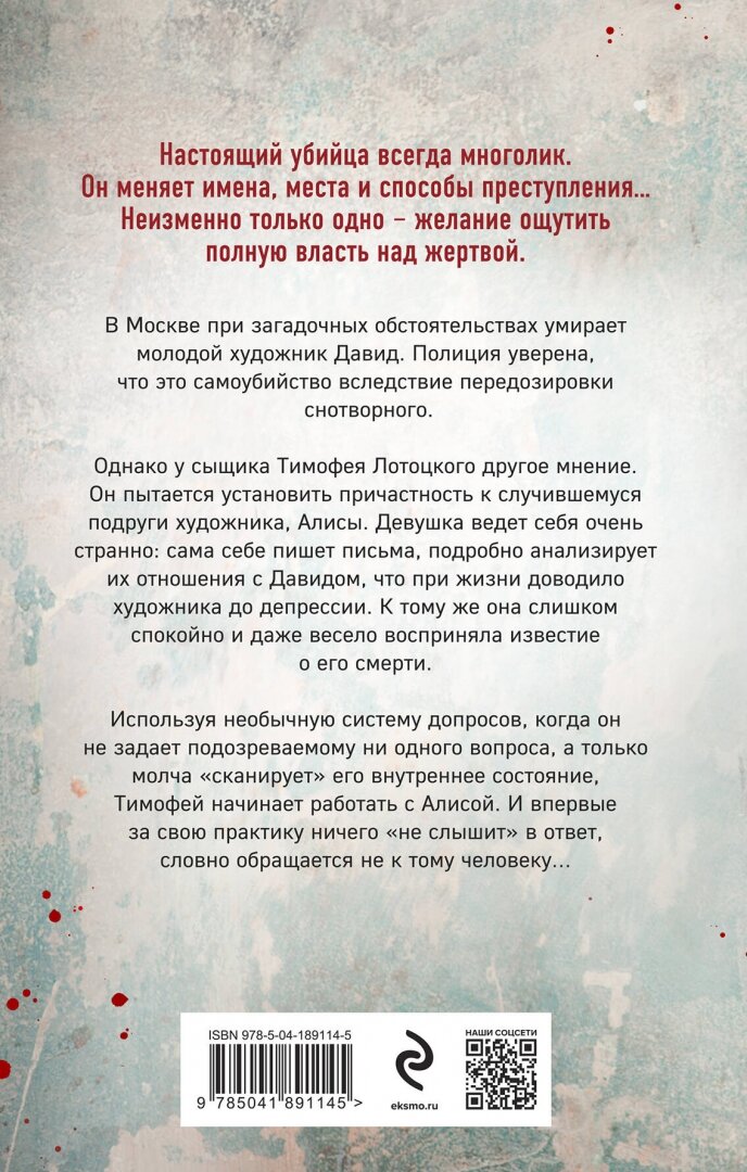 В Москве при загадочных обстоятельствах умирает молодой художник Давид. Полиция уверена, что это самоубийство вследствие передозировки снотворного. Однако, у сыщика Тимофея Лотоцкого другое мнение. Он пытается установить причастность к случившемуся подруги художника, Алисы. Девушка ведет себя очень странно: сама себе пишет письма, подробно анализирует их отношения с Давидом, что при жизни доводило художника до депрессии. К тому же, она слишком спокойно и даже весело восприняла известие о его смерти. Используя необычную систему допросов, когда он не задает подозреваемому ни одного вопроса, а только молча "сканирует" его внутреннее состояние, Тимофей начинает работать с Алисой. И впервые за свою практику ничего "не слышит" в ответ, словно обращается не к тому человеку...