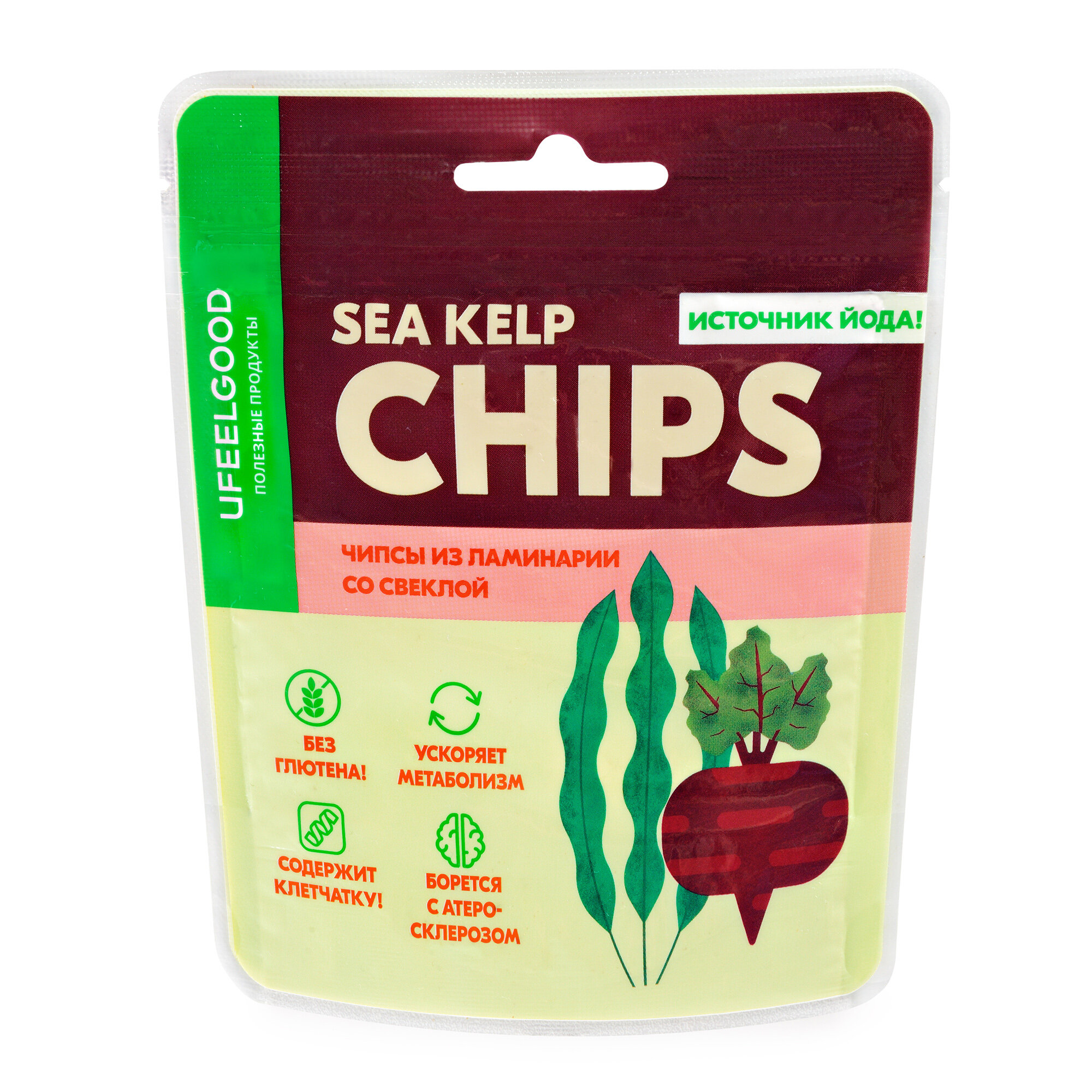 Снеки из ламинарии со свеклой и базиликомПопробуйте удивительно вкусные овощные снеки с ламинарией, свеклой и базиликом. В составе овощных чипсов только натуральные компоненты из российского сырья: свежая свекла, базилик, сушеная ламинария, семена подсолнечника и льна, морская соль.В качестве замены хлебу, они не содержат дрожжей и глютена, что делает их прекрасным выбором для людей с непереносимостью. Не содержащие консервантов, глютена, сахара, ГМО, красителей и других искусственных добавок, они являются полностью натуральным продуктом.В каждой пачке чипсов UFEELGOOD до 7 г клетчатки, что составляет до 25% от рекомендуемой ежедневной нормы! Высокое содержание клетчатки важно для работы вашего ЖКТ. Свекла в составе полезных снеков является отличным источником железа, улучшает кроветворение. Содержащиеся в свекле нитраты способствуют снижению артериального давления. Уникальные антиоксиданты в свекле помогают очищать печень от токсинов, а клетчатка способствует нормализации работы кишечника, предотвращает запоры.Базилик содержит витамины А, С и К, которые защищают от преждевременного старения клеток, инфекций и болезней, снижает уровень холестерина. Наш постный продукт богат йодом, который важен для правильного функционирования щитовидной железы. В каждой порции более 25% суточной нормы потребления!Попробуйте наши ПП чипсы до или после тренировки, чтобы восстановить энергию. Возьмите с собой набор снеков в дорогу, на работу, чтобы всегда иметь под рукой удобный и полезный перекус.