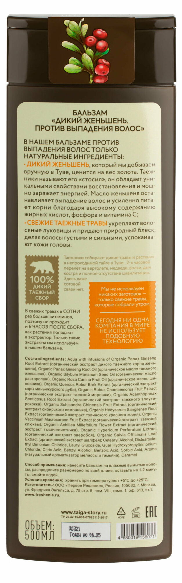 В нашем бальзаме против выпадения волос только натуральные ингредиенты: ДИКИЙ ЖЕНЬШЕНЬ, который мы добываем вручную в Туве, ценится на вес золота. Таежники называют его стосил, он обладает уникальными свойствами восстановления и мощно заряжает энергией. Масло женьшеня останавливает выпадение волос и усиленно питает корни благодаря высокому содержанию жирных кислот, фосфора и витамина С; СВЕЖИЕ ТАЕЖНЫЕ ТРАВЫ укрепляют волосяные луковицы и придают природный блеск, делая волосы густыми и сильными, успокаивают кожи головы. - борется со стресс-факторами, такими как: фен, мороз, солнце, сухой воздух; - останавливает выпадение волос;- успокаивает и питает кожу головы, укрепляя корни волос.