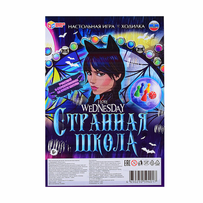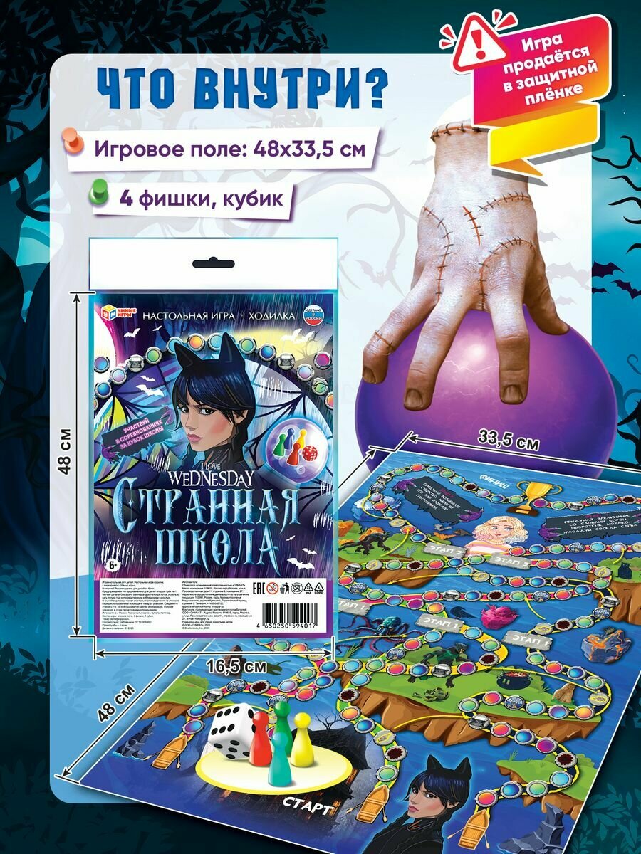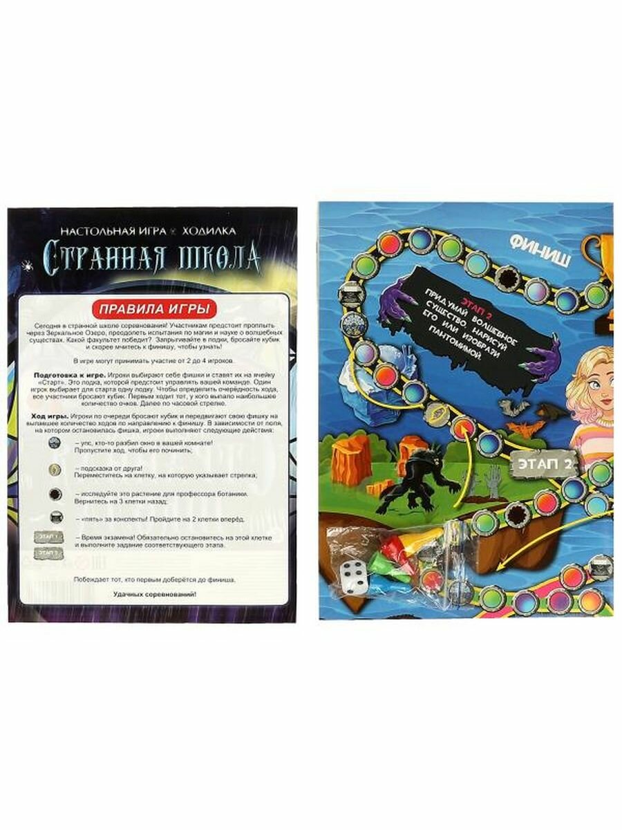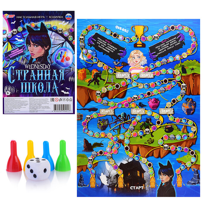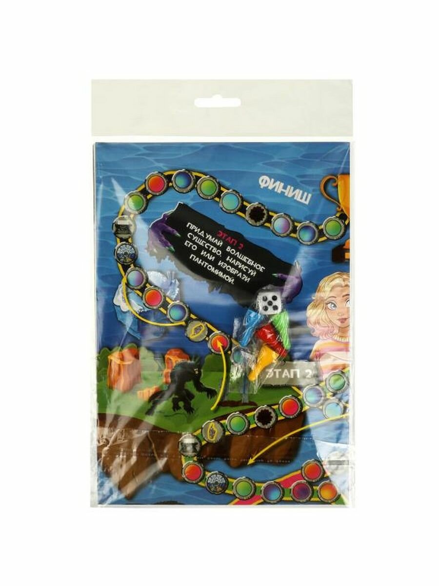 В наборе предусмотрено яркое игровое поле с красочными иллюстрациями, кубик и фишки разных цветов (4 шт.).
