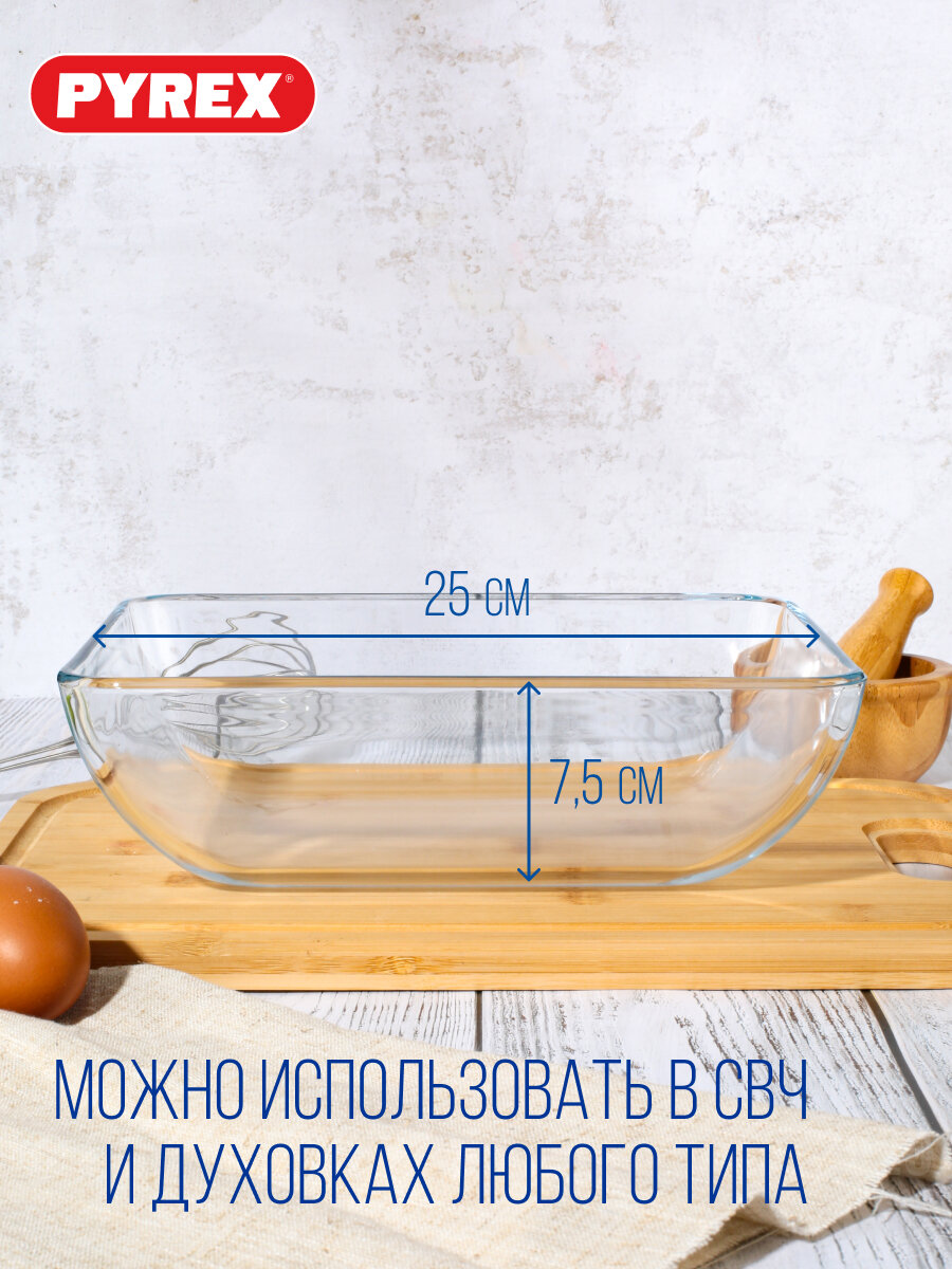 Для широкого застолья и разнообразия блюд Запеченная курочка, мясо, овощи - отличное решение для приготовления семейного ужина. Глубокие форм для запекания из жаопрочного боросиликатного стекла сверхпрочные и практичные благодаря большим боковым ручкам. Основные характеристики: Глубокая форма для выпечки: во время приготовления жидкость, жир не вытекает из формы. Большие ручки: удобно доставать из духовки даже с прихваткой. Безопасное использование в микроволновой печи. Посуда Pyrex - выбор практичных хозяек. Она не только прослужит гораздо дольше, чем другая посуда на кухне, но и не потеряет своего внешнего вида. Абсолютная гладкая, непористая поверхность противостоит образованию царапин, пятен, не впитывает запахи и отлично переносит как ручную, так и машинную мойку. Так годы спустя ваша посуда Pyrex будет выглядеть как новая.